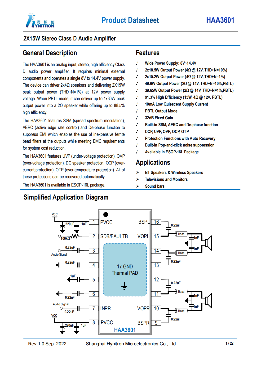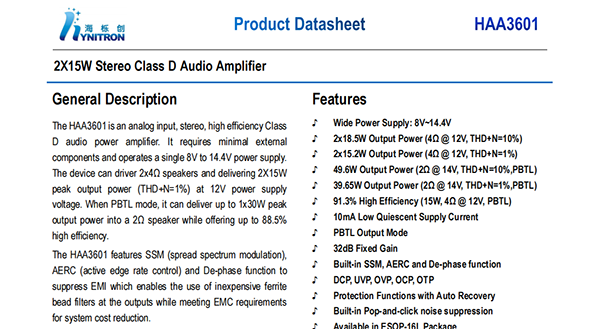 The HAA3601 features UVP(under-voltage protection),OVP(over-voltage protection),DC speaker protection,OCP(overcurrent protection),OTP(over-temperature protection).All of these protections can be recovered automatically.The HAA3601 is available in ESOP-16L package.