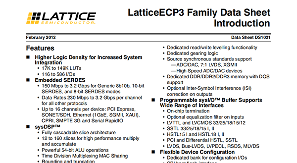 The LatticeECP3™ (EConomy Plus Third generation) family of FPGA devices is optimized to deliver high performance features such as an enhanced DSP architecture, high speed SERDES and high speed source synchronous interfaces in an economical FPGA fabric
