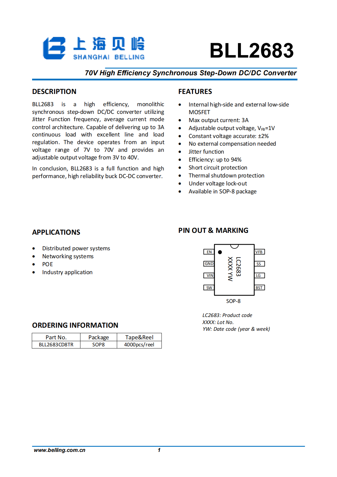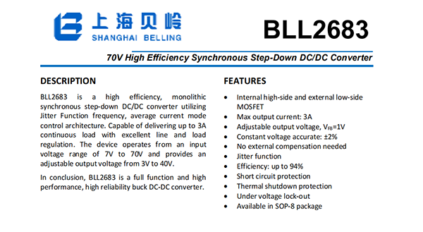 BLL2683 is a high efficiency,monolithic synchronous step-down DC/DC converter utilizing Jitter Function frequency,average current mode control architecture.Capable of delivering up to 3A continuous load with excellent line and load regulation.The device operates from an input voltage range of 7V to 70V and provides an adjustable output voltage from 3V to 40V.