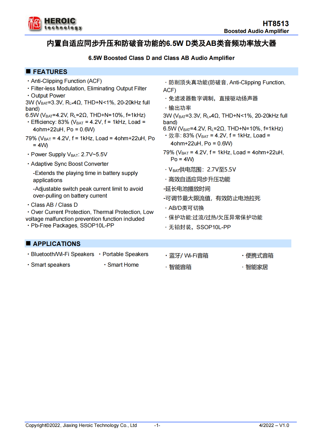 3W(VBAT=3.3V,RL=4Ω,THD+N<1%,20-20kHz full band)