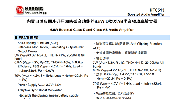 ・效率:83%(VBAT=4.2V,f=1kHz,Load=4ohm+22uH,Po=0.6W)