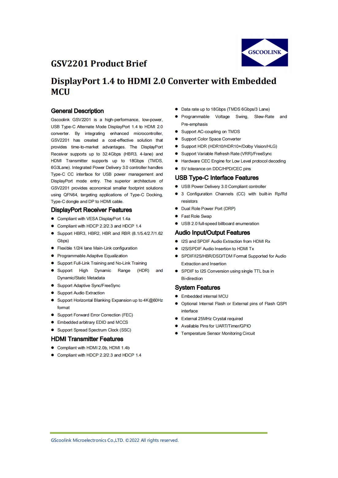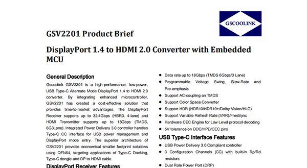 Gscoolink GSV2201 is a high-performance,low-power,USB Type-C Alternate Mode DisplayPort 1.4 to HDMI 2.0 converter.By integrating enhanced microcontroller,GSV2201 has created a cost-effective solution that provides time-to-market advantages.The DisplayPort Receiver supports up to 32.4Gbps(HBR3,4-lane)and HDMI Transmitter supports up to 18Gbps(TMDS,6G3Lane).Integrated Power Delivery 3.0 controller handles Type-C CC interface for USB power management and DisplayPort mode entry.The superior architecture of GSV2201 provides economical smaller footprint solutions using QFN64,targeting applications of Type-C Docking,Type-C dongle and DP to HDMI cable.