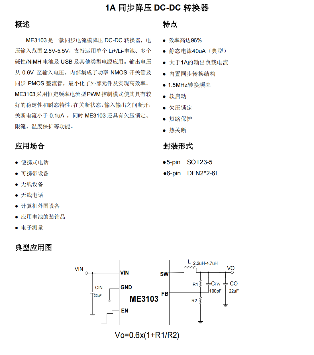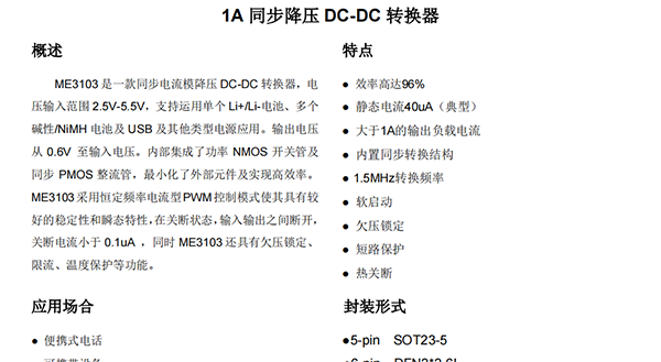 ME3103是一款同步电流模降压DC-DC转换器,电压输入范围2.5V-5.5V,支持运用单个Li+/Li-电池、多个碱性/NiMH电池及USB及其他类型电源应用。输出电压从0.6V至输入电压。内部集成了功率NMOS开关管及同步PMOS整流管,最小化了外部元件及实现高效率。