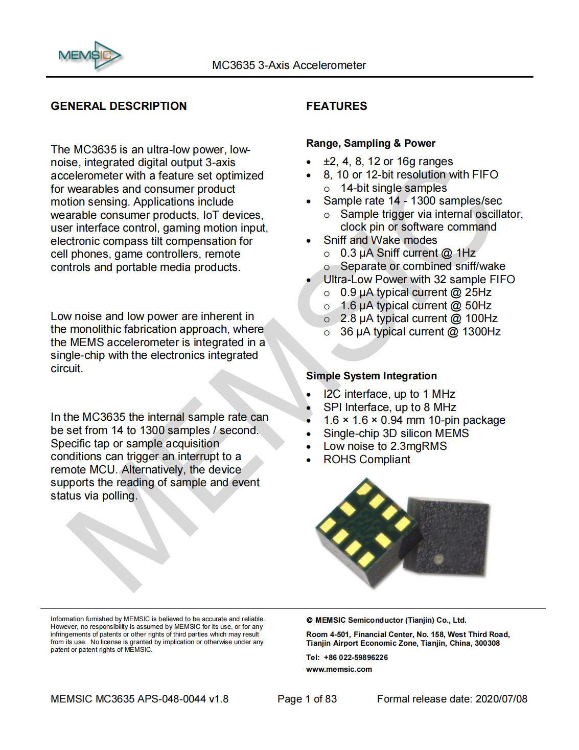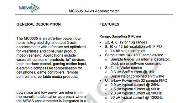 The MC3635 is an ultra-low power,lownoise,integrated digital output 3-axis accelerometer with a feature set optimized for wearables and consumer product motion sensing.Applications include wearable consumer products,IoT devices,user interface control,gaming motion input,electronic compass tilt compensation for cell phones,game controllers,remote controls and portable media products.