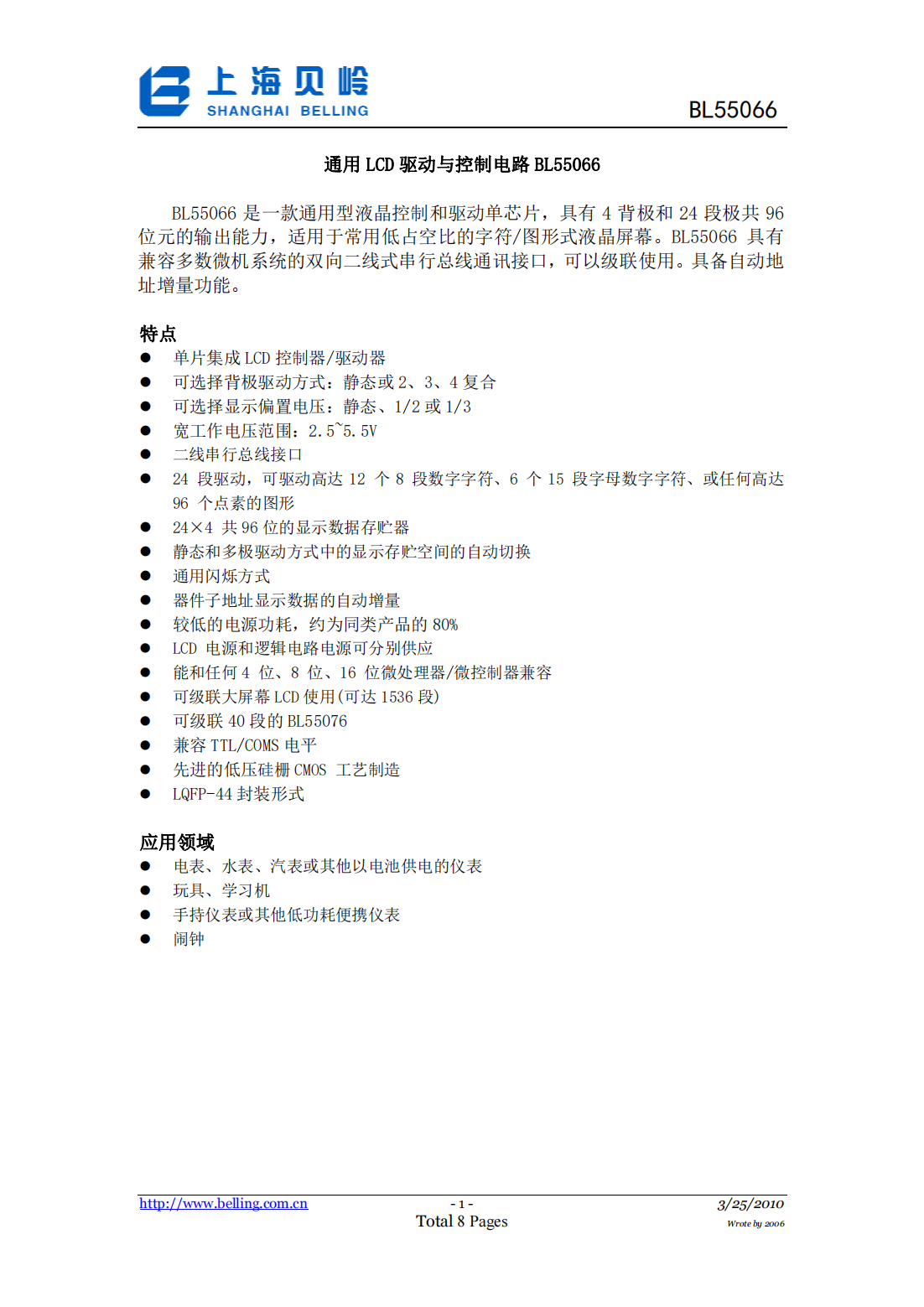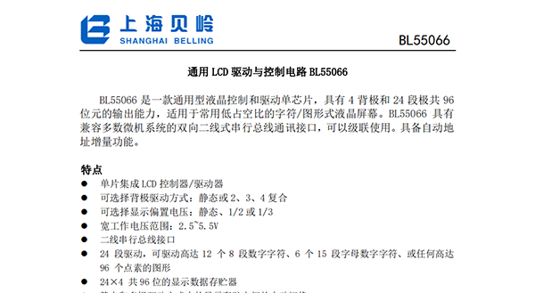 BL55066是一款通用型液晶控制和驱动单芯片,具有4背极和24段极共96位元的输出能力,适用于常用低占空比的字符/图形式液晶屏幕。BL55066具有兼容多数微机系统的双向二线式串行总线通讯接口,可以级联使用。具备自动地址增量功能。