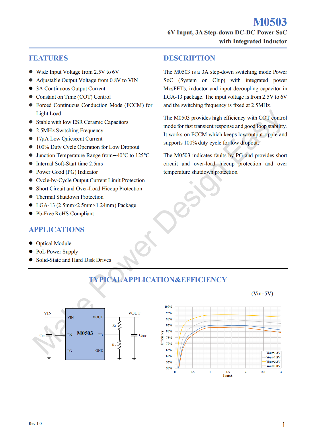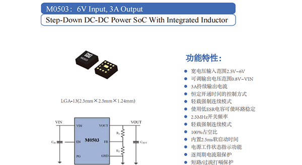 功能特性 宽电压输入范围2.5V~6V 可调输出电压范围0.8V~VIN 3A持续输出电流 恒定开通时间的控制方式 轻载强制连续模式 使用低ESR电容可使环路稳定 2.5MHz开关频率 轻载强制连续模式 100%占空比 内置2.5ms软启动时间 电源工作状态指示功能 逐周期电流限保护 短路/过流打嗝保护 过温保护