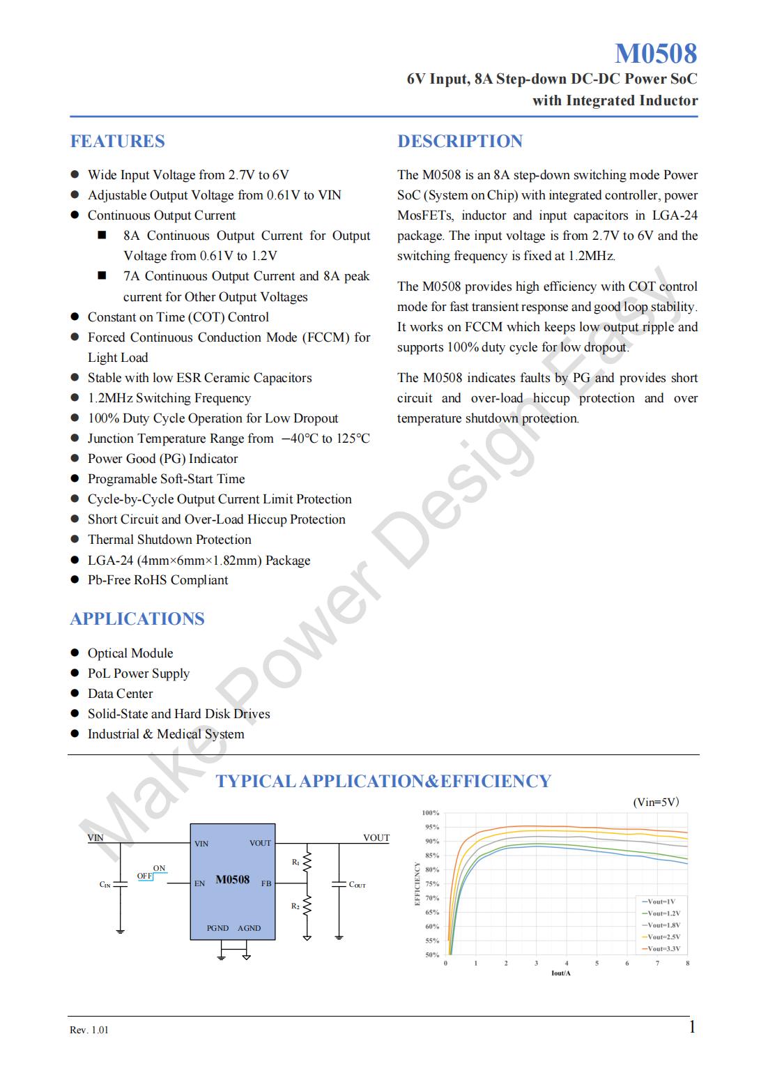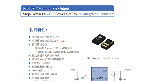 功能特性 宽电压输入范围2.7V~6V 可调输出电压范围0.61V~VIN 持续输出电流 输出电压为0.61~1.2V时,8A持续输出 其他输出电压时,7A持续输出,8A峰值输出 恒定开通时间的控制方式 使用低ESR电容可使环路稳定 1.2MHz开关频率 轻载强制连续模式 100%占空比 电源工作状态指示功能 可调软启动时间 逐周期电流限保护 短路/过流打嗝保护 过温保护