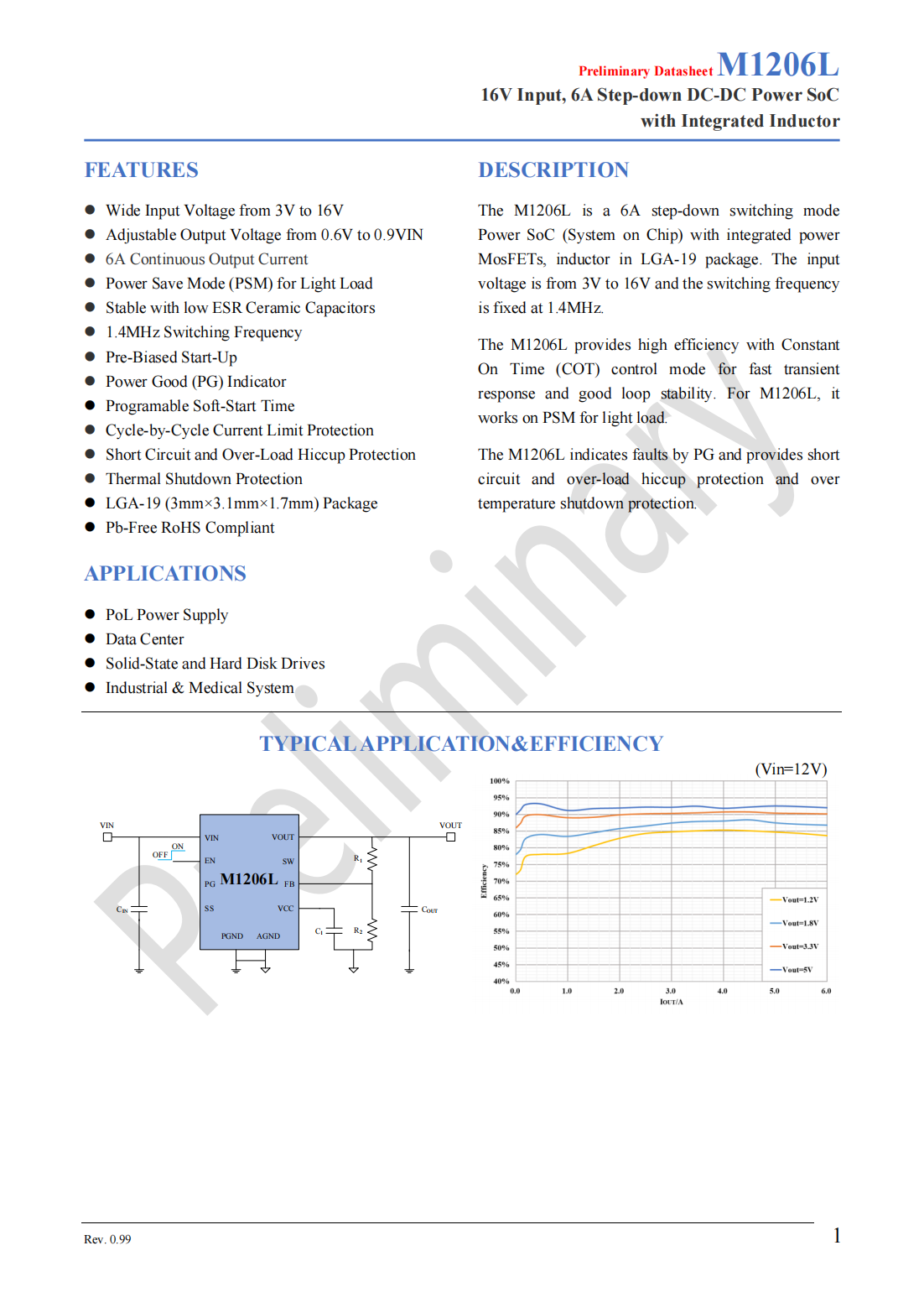 宽电压输入范围3V~16V 可调输出电压范围0.6V~0.9VIN 6A持续输出电流 恒定开通时间的控制方式 使用低ESR电容可使环路稳定 1.4MHz开关频率 轻载高效模式 输出预偏置启动 可调软启动时间 电源工作状态指示功能 逐周期电流限保护 短路/过流打嗝保护 过温保护