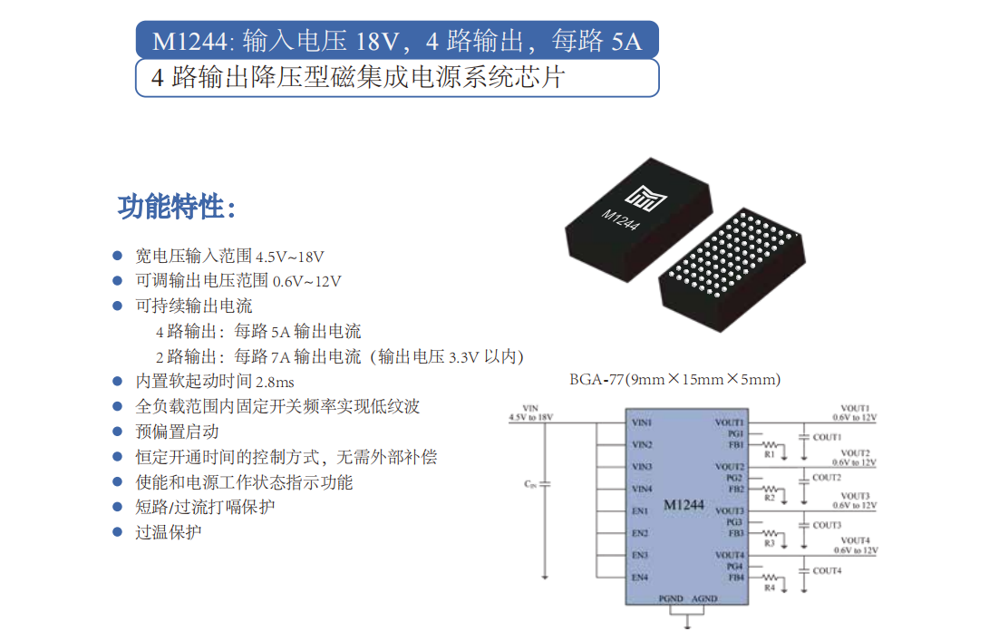 宽电压输入范围4.5V~18V 可调输出电压范围0.6V~12V 可持续输出电流 4路输出:每路5A输出电流 2路输出:每路7A输出电流(输出电压3.3V以内) 内置软起动时间2.8ms 全负载范围内固定开关频率实现低纹波 预偏置启动 恒定开通时间的控制方式,无需外部补偿 使能和电源工作状态指示功能 短路/过流打嗝保护 过温保护