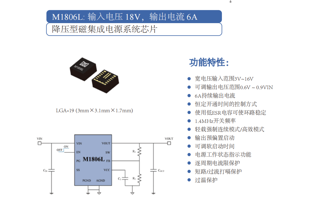 宽电压输入范围3V~16V 可调输出电压范围0.6V~0.9VIN 6A持续输出电流 恒定开通时间的控制方式 使用低ESR电容可使环路稳定 1.4MHz开关频率 轻载强制连续模式/高效模式 输出预偏置启动 可调软启动时间 电源工作状态指示功能 逐周期电流限保护 短路/过流打嗝保护 过温保护