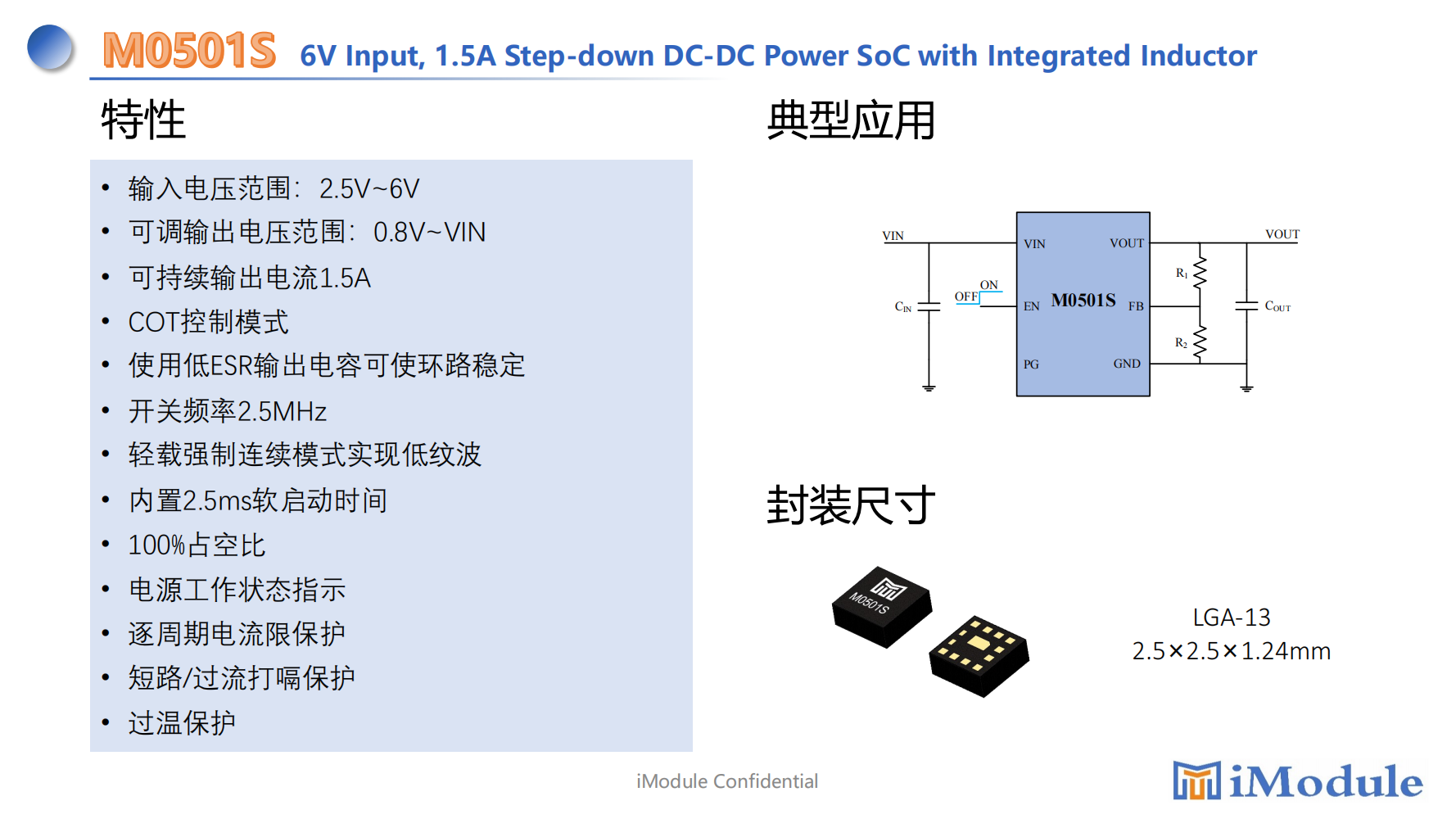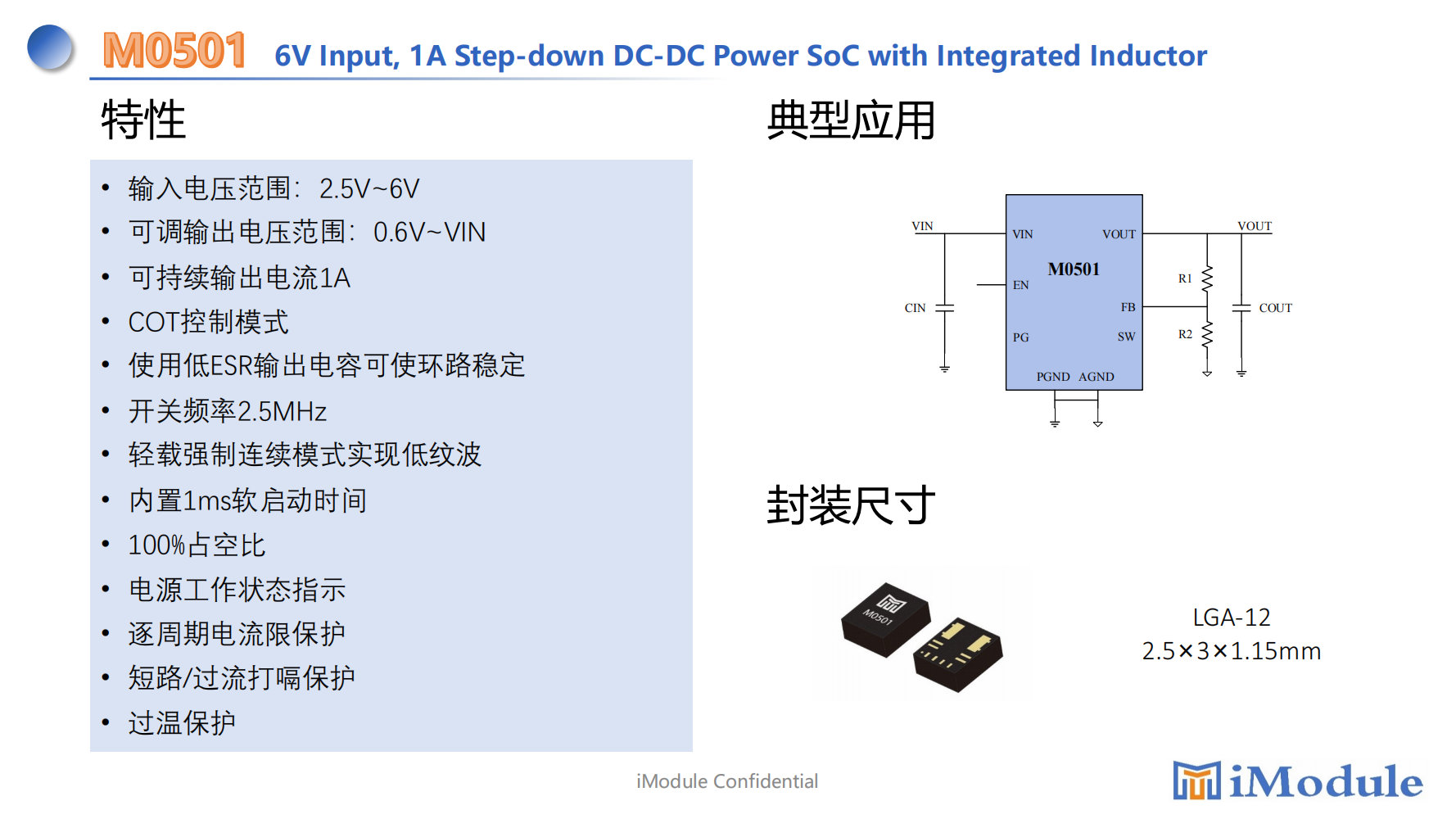 •输⼊电压范围:2.5V~6V •可调输出电压范围:0.6V~VIN •可持续输出电流1A •COT控制模式 •使⽤低ESR输出电容可使环路稳定 •开关频率2.5MHz •轻载强制连续模式实现低纹波 •内置1ms软启动时间 •100%占空⽐ •电源⼯作状态指示 •逐周期电流限保护 •短路/过流打嗝保护 •过温保护