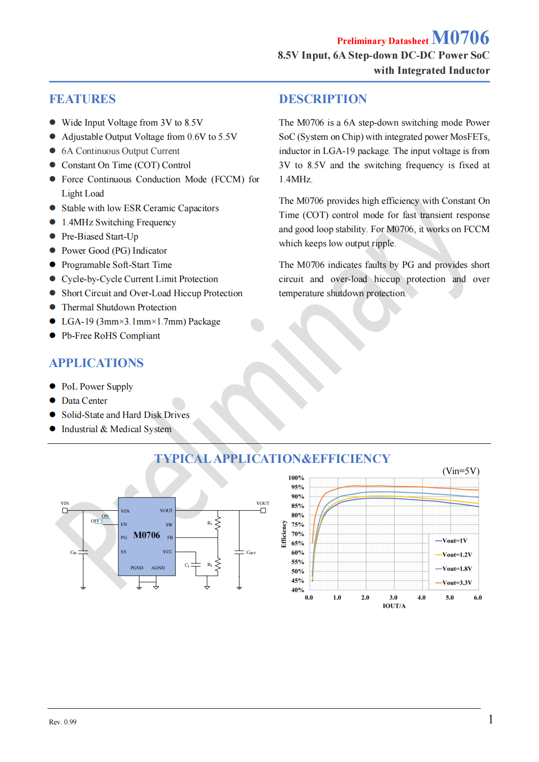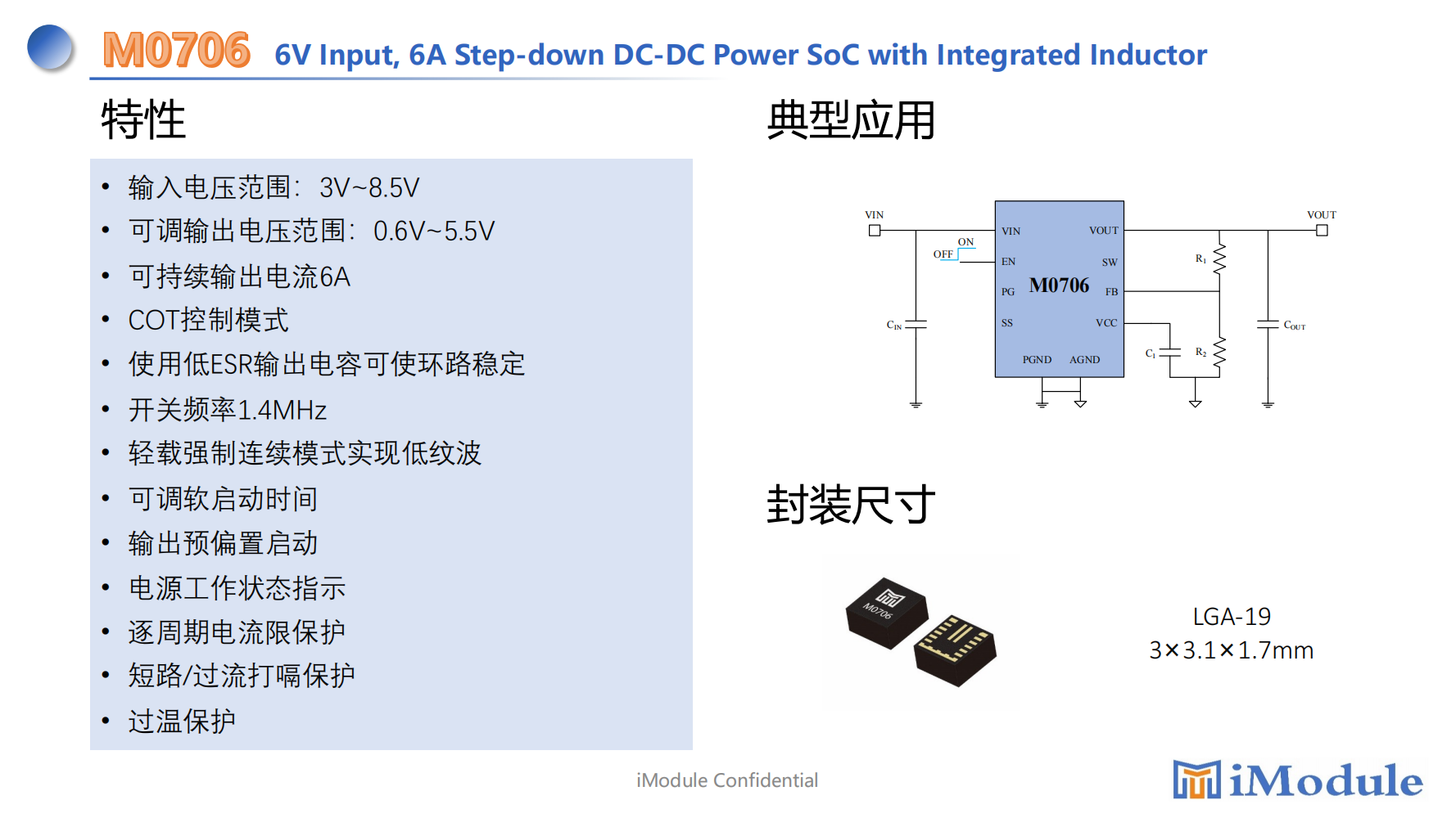 The M0706 is a 6A step-down switching mode Power SoC(System on Chip)with integrated power MosFETs,inductor in LGA-19 package.The input voltage is from 3V to 8.5V and the switching frequency is fixed at 1.4MHz.