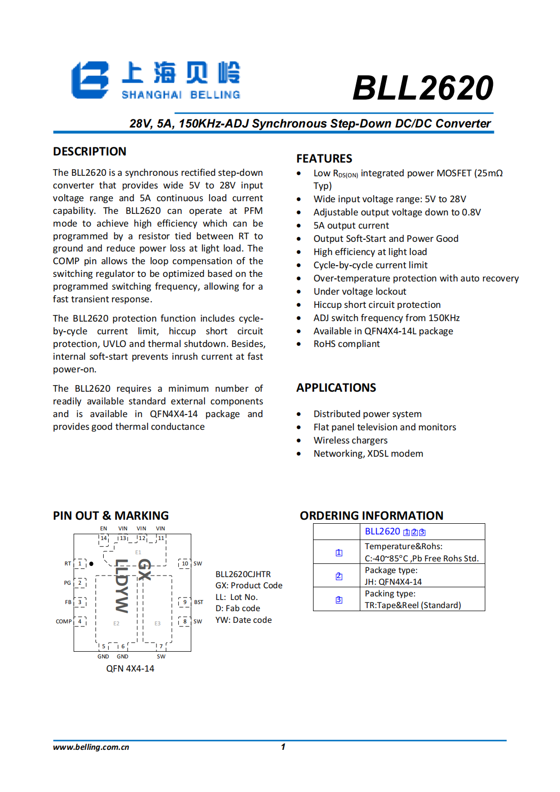The BLL2620 requires a minimum number of readily available standard external components and is available in QFN4X4-14 package and provides good thermal conductance