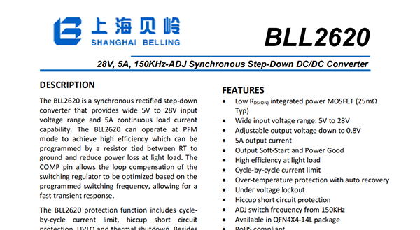The BLL2620 is a synchronous rectified step-down converter that provides wide 5V to 28V input voltage range and 5A continuous load current capability.The BLL2620 can operate at PFM mode to achieve high efficiency which can be programmed by a resistor tied between RT to ground and reduce power loss at light load.The COMP pin allows the loop compensation of the switching regulator to be optimized based on the programmed switching frequency,allowing for a fast transient response.