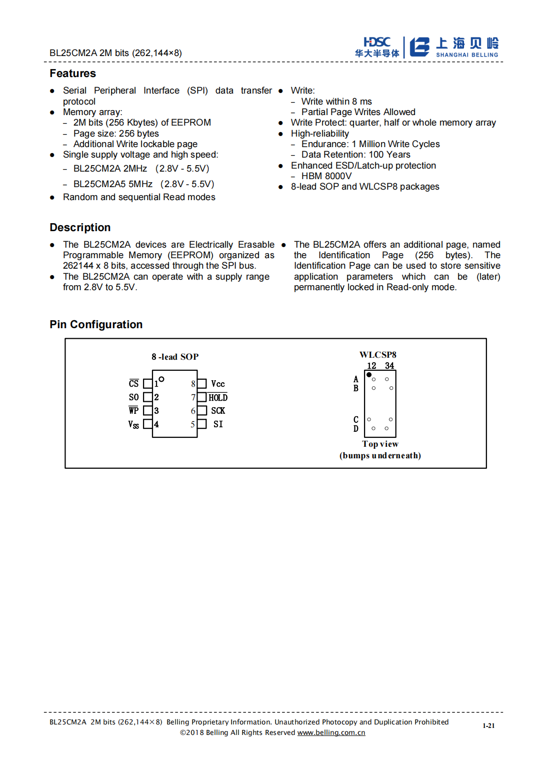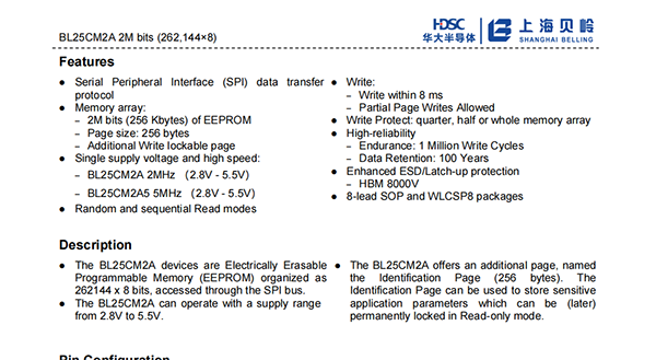 ⚫The BL25CM2A devices are Electrically Erasable Programmable Memory(EEPROM)organized as 262144 x 8 bits,accessed through the SPI bus.