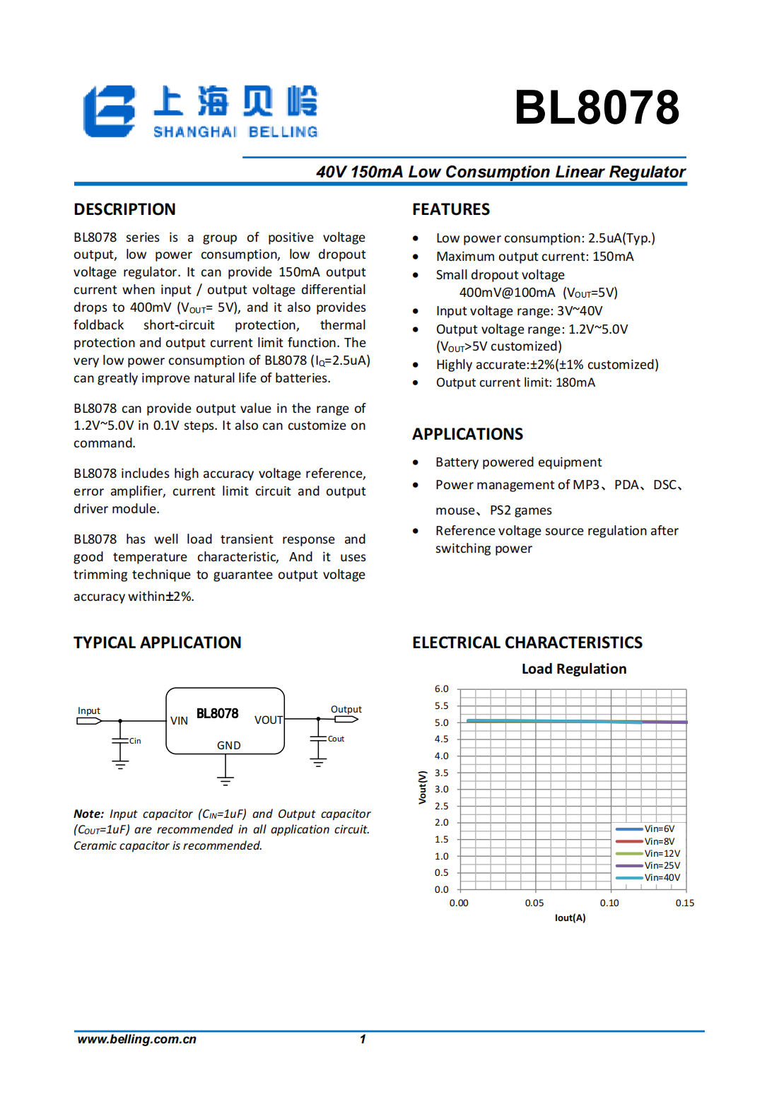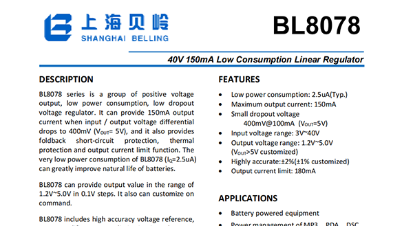 BL8078 series is a group of positive voltage output,low power consumption,low dropout voltage regulator.It can provide 150mA output current when input/output voltage differential drops to 400mV(VOUT=5V),and it also provides foldback short-circuit protection,thermal protection and output current limit function.The