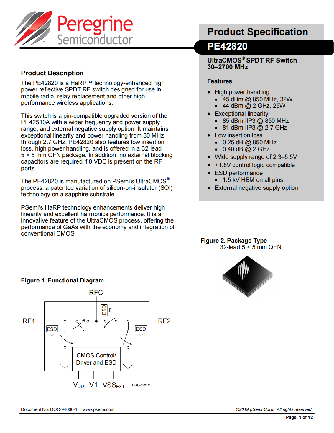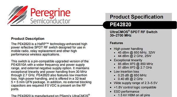 The PE42820 is a HaRP™technology-enhanced high power reflective SPDT RF switch designed for use in mobile radio,relay replacement and other high performance wireless applications.