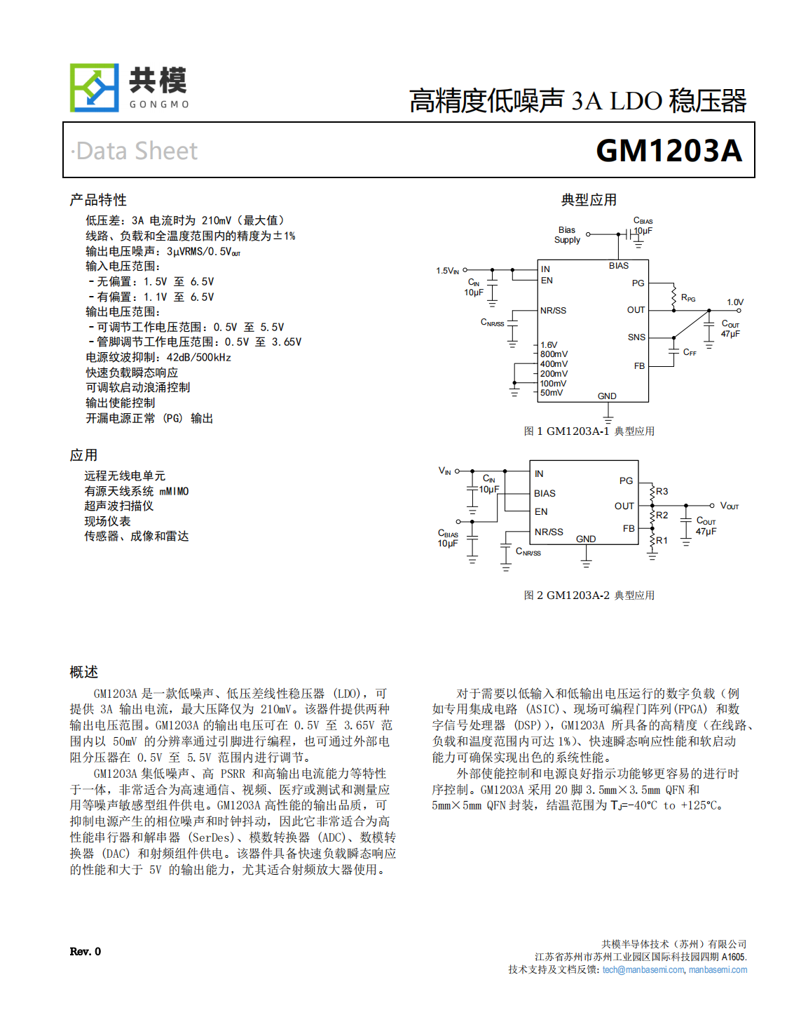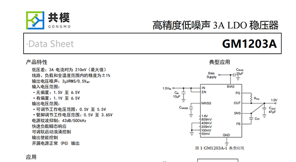 GM1203A集低噪声、高PSRR和高输出电流能力等特性于一体,非常适合为高速通信、视频、医疗或测试和测量应用等噪声敏感型组件供电。GM1203A高性能的输出品质,可抑制电源产生的相位噪声和时钟抖动,因此它非常适合为高性能串行器和解串器(SerDes)、模数转换器(ADC)、数模转换器(DAC)和射频组件供电。该器件具备快速负载瞬态响应的性能和大于5V的输出能力,尤其适合射频放大器使用。