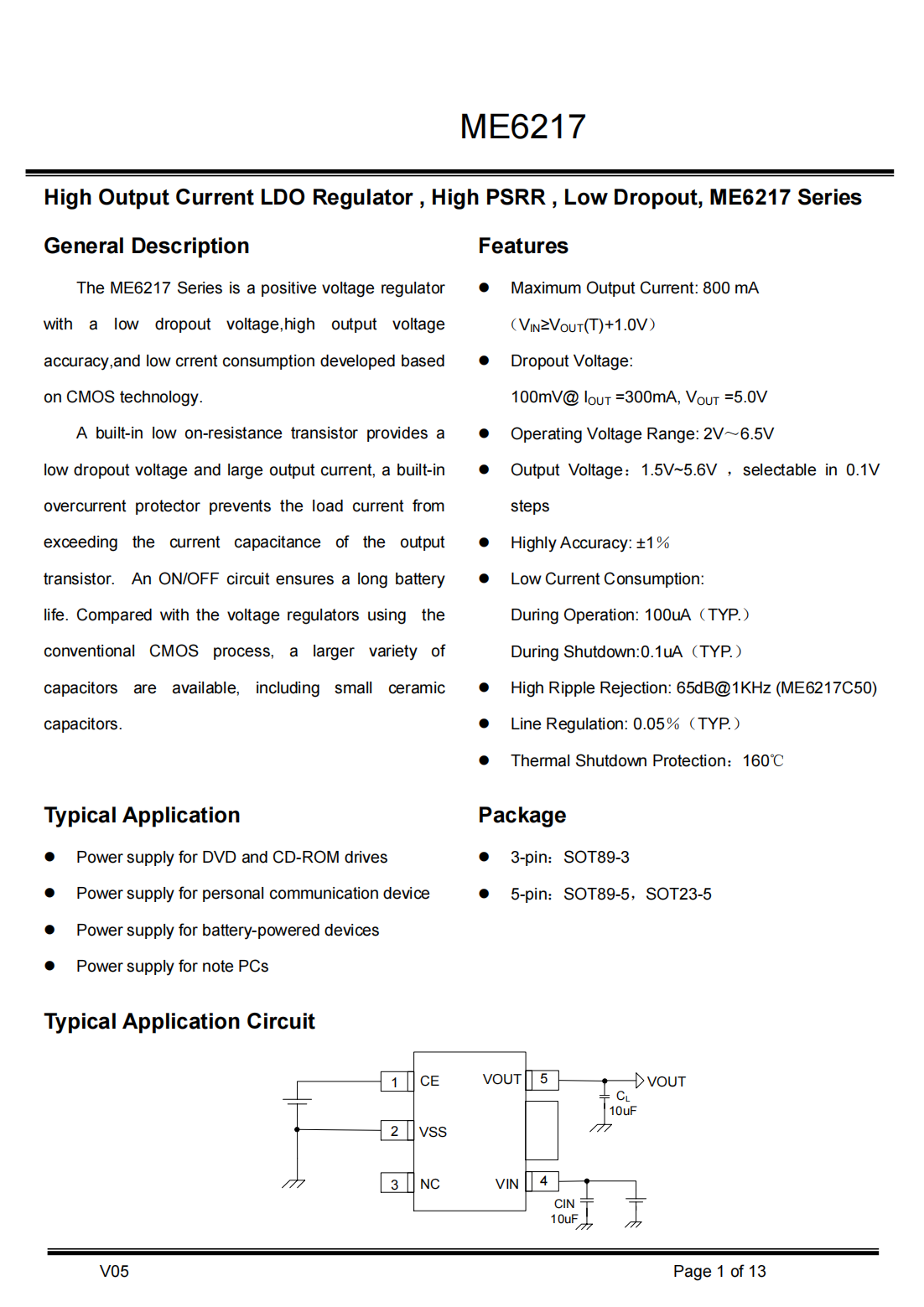 The ME6217 Series is a positive voltage regulator with a low dropout voltage,high output voltage accuracy,and low crrent consumption developed based on CMOS technology.A built-in low on-resistance transistor provides a low dropout voltage and large output current,a built-in overcurrent protector prevents the load current from exceeding the current capacitance of the output transistor.An ON/OFF circuit ensures a long battery life.Compared with the voltage regulators using the conventional CMOS process,a larger variety of capacitors are available,including small ceramic capacitors.