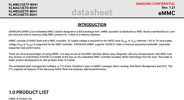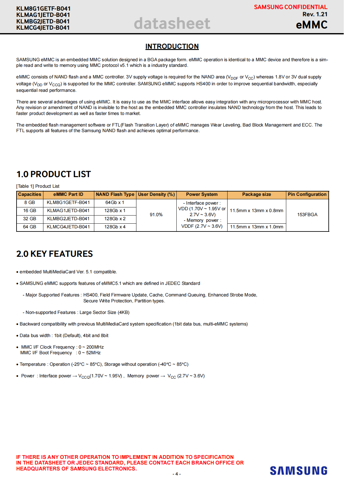eMMC consists of NAND flash and a MMC controller.3V supply voltage is required for the NAND area(VDDF or VCC)whereas 1.8V or 3V dual supply voltage(VDD or VCCQ)is supported for the MMC controller.SAMSUNG eMMC supports HS400 in order to improve sequential bandwidth,especially sequential read performance.