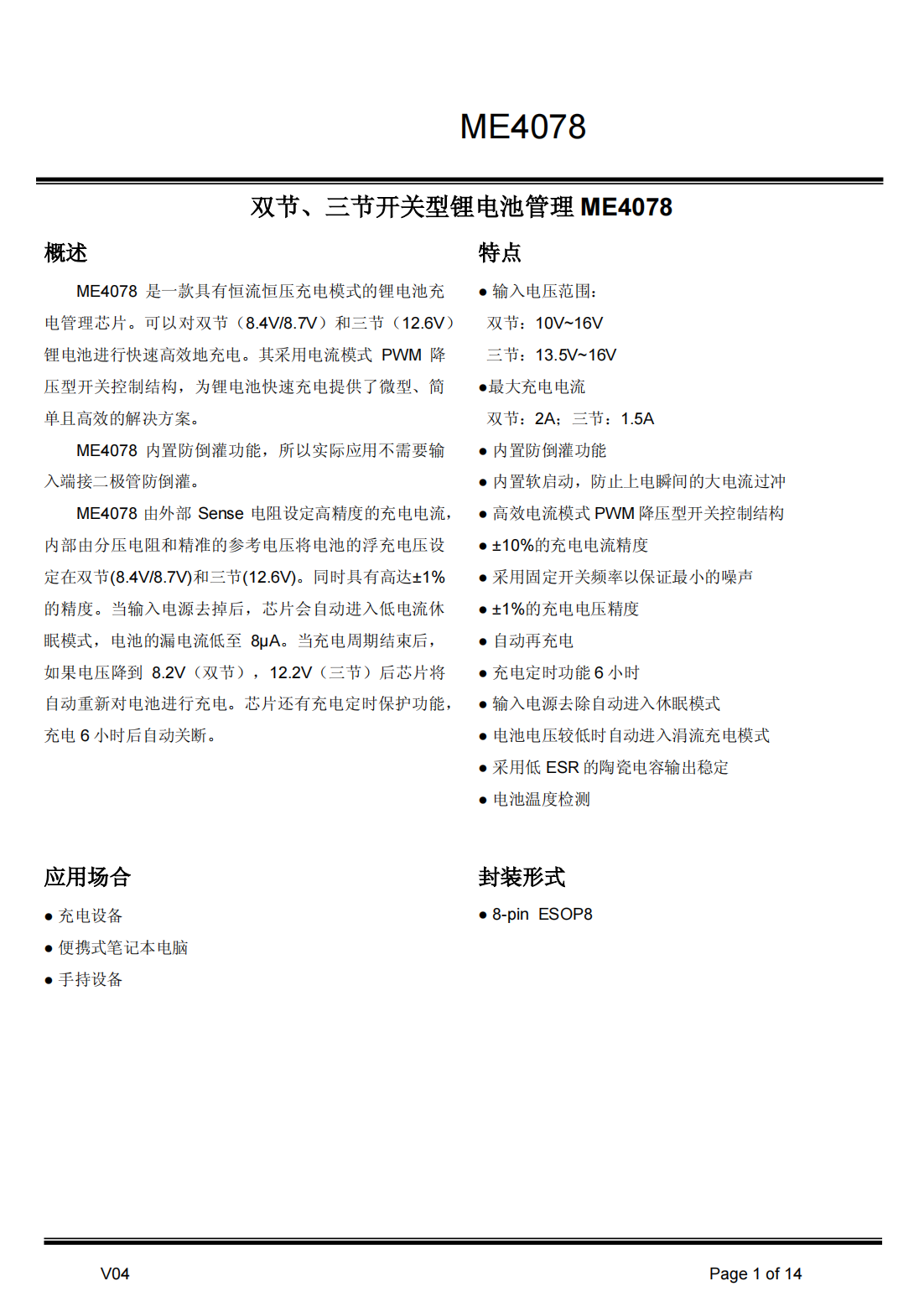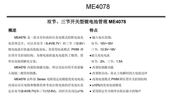 ME4078由外部Sense电阻设定高精度的充电电流,内部由分压电阻和精准的参考电压将电池的浮充电压设定在双节(8.4V/8.7V)和三节(12.6V)。同时具有高达±1%的精度。当输入电源去掉后,芯片会自动进入低电流休眠模式,电池的漏电流低至8μA。当充电周期结束后,如果电压降到8.2V(双节),12.2V(三节)后芯片将自动重新对电池进行充电。芯片还有充电定时保护功能,充电6小时后自动关断。