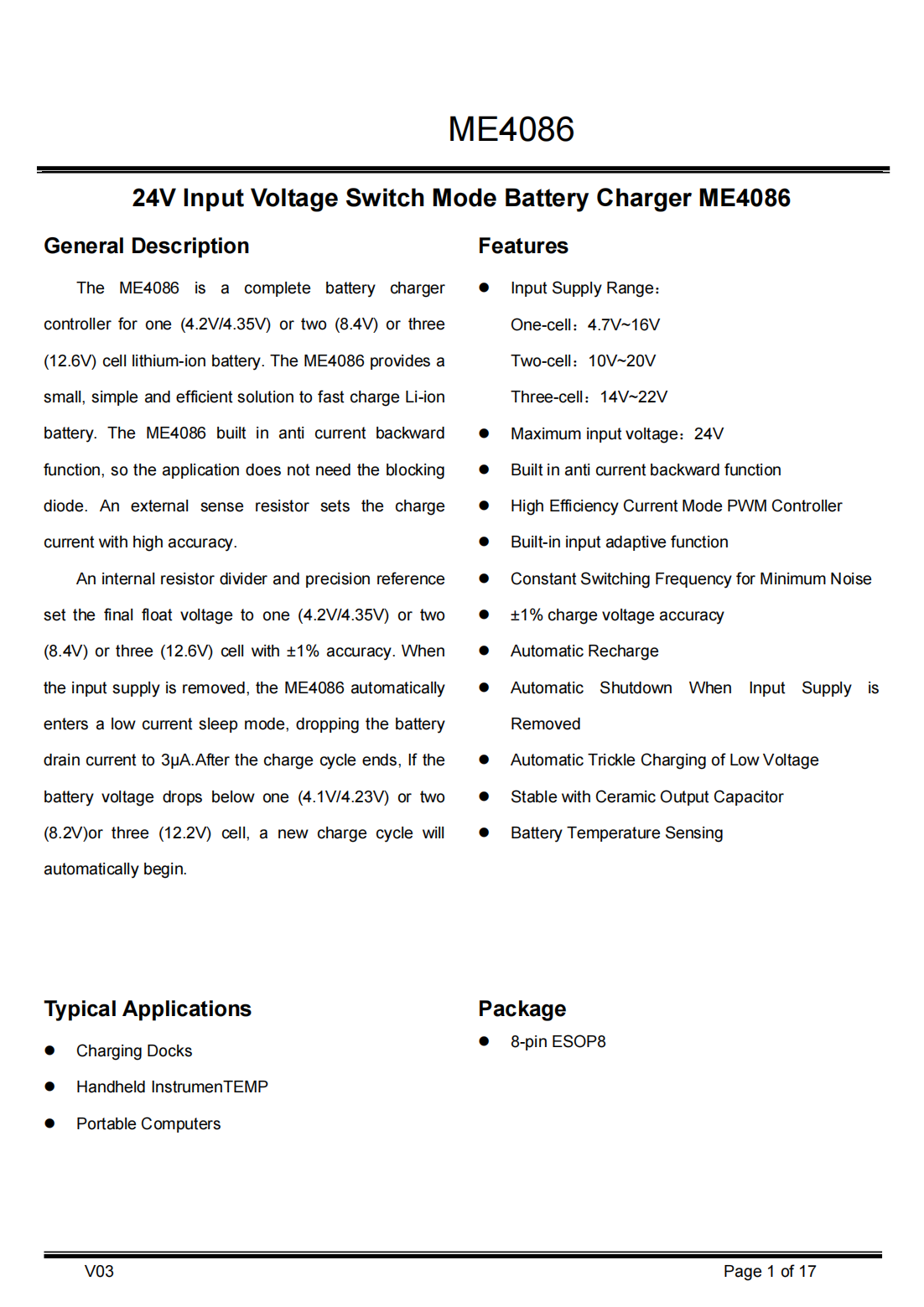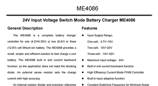 The ME4086 is a complete battery charger controller for one(4.2V/4.35V)or two(8.4V)or three(12.6V)cell lithium-ion battery.The ME4086 provides a small,simple and efficient solution to fast charge Li-ion battery.The ME4086 built in anti current backward function,so the application does not need the blocking diode.An external sense resistor sets the charge current with high accuracy.