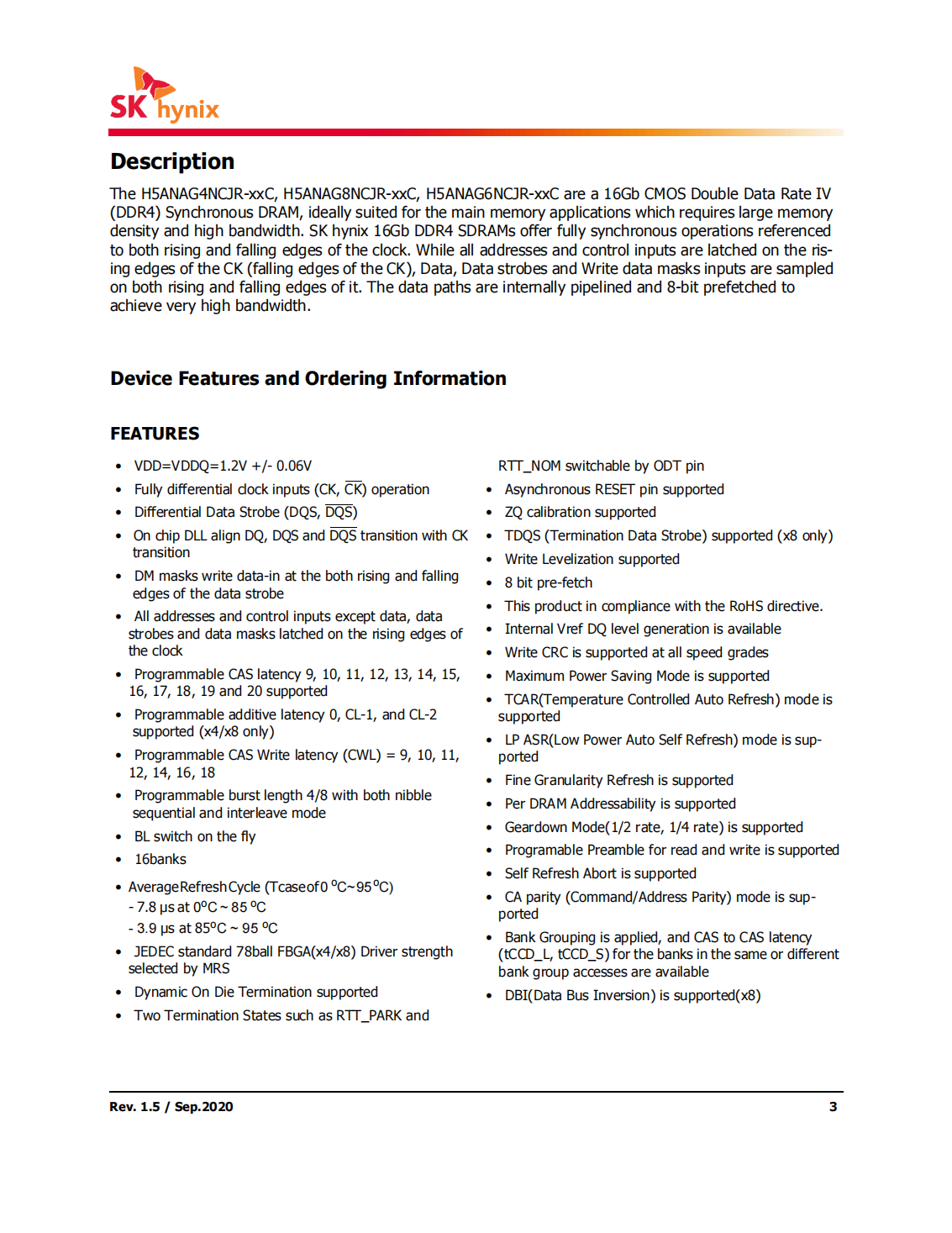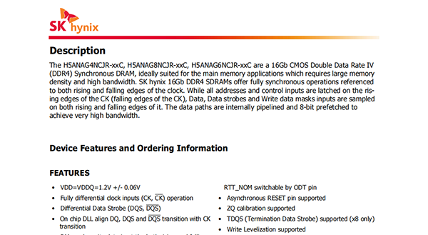 The H5ANAG4NCJR-xxC,H5ANAG8NCJR-xxC,H5ANAG6NCJR-xxC are a 16Gb CMOS Double Data Rate IV(DDR4)Synchronous DRAM,ideally suited for the main memory applications which requires large memory density and high bandwidth.SK hynix 16Gb DDR4 SDRAMs offer fully synchronous operations referenced to both rising and falling edges of the clock.While all addresses and control inputs are latched on the rising edges of the CK(falling edges of the CK),Data,Data strobes and Write data masks inputs are sampled on both rising and falling edges of it.The data paths are internally pipelined and 8-bit prefetched to achieve very high bandwidth.