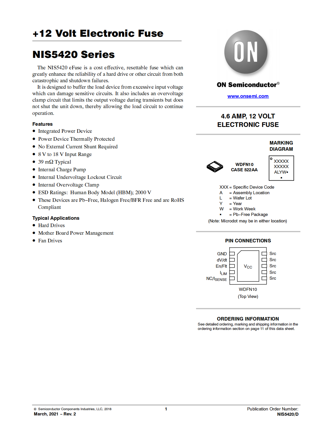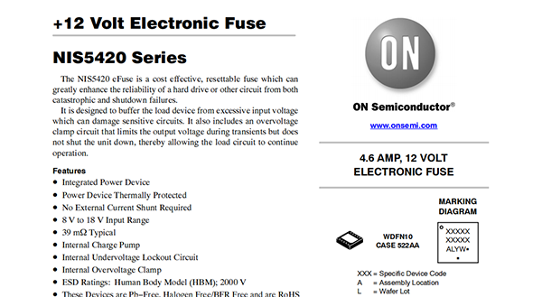 The NIS5420 eFuse is a cost effective,resettable fuse which can greatly enhance the reliability of a hard drive or other circuit from both catastrophic and shutdown failures.It is designed to buffer the load device from excessive input voltage which can damage sensitive circuits.It also includes an overvoltage clamp circuit that limits the output voltage during transients but does not shut the unit down,thereby allowing the load circuit to continue operation.