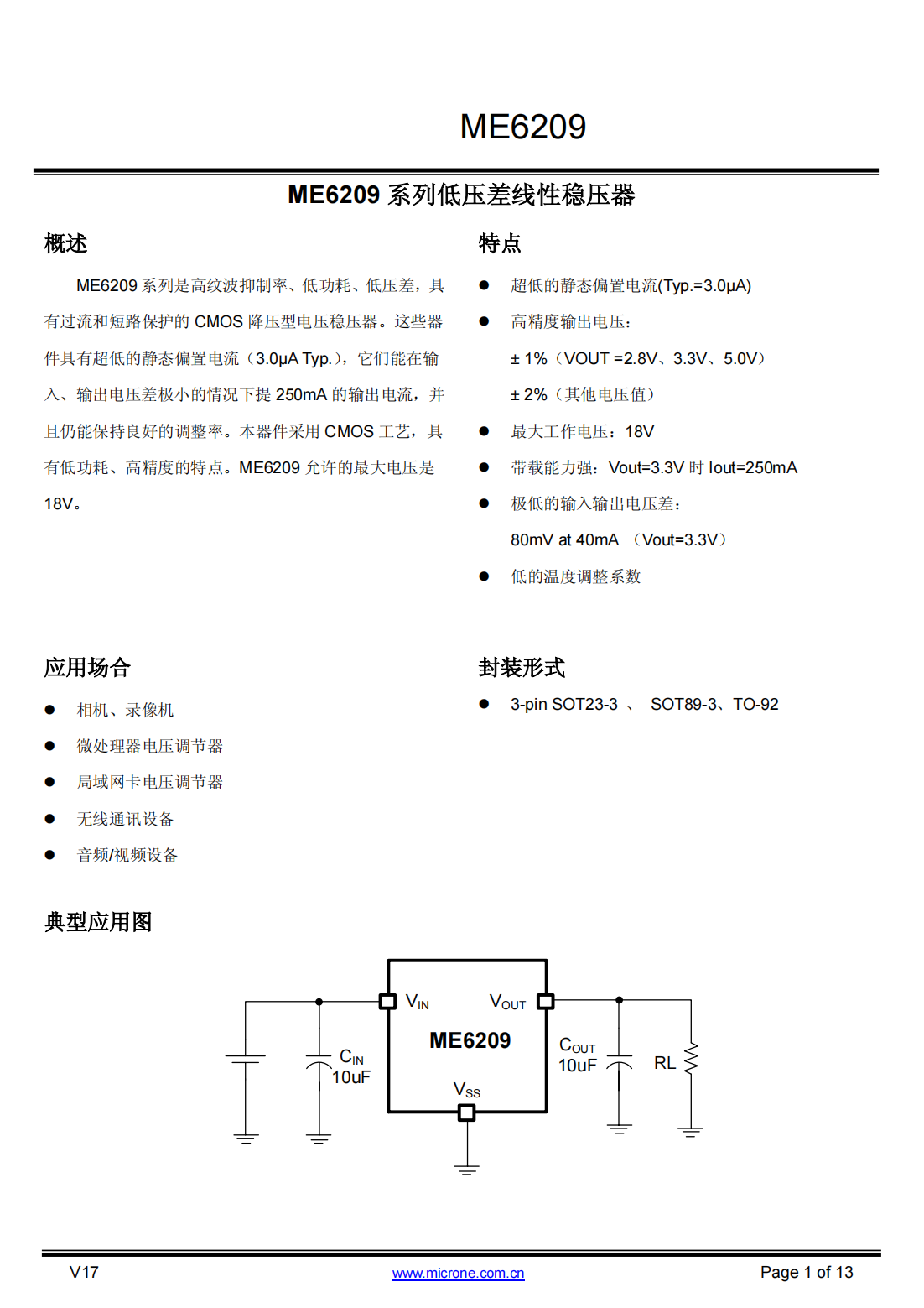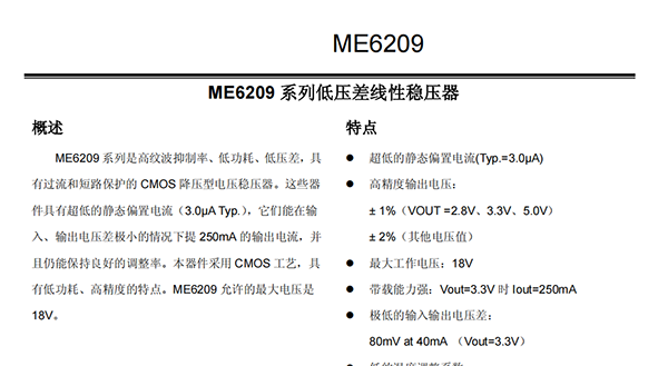ME6209系列是高纹波抑制率、低功耗、低压差,具有过流和短路保护的CMOS降压型电压稳压器。这些器件具有超低的静态偏置电流(3.0μA Typ.),它们能在输入、输出电压差极小的情况下提250mA的输出电流,并且仍能保持良好的调整率。本器件采用CMOS工艺,具有低功耗、高精度的特点。ME6209允许的最大电压是18V。