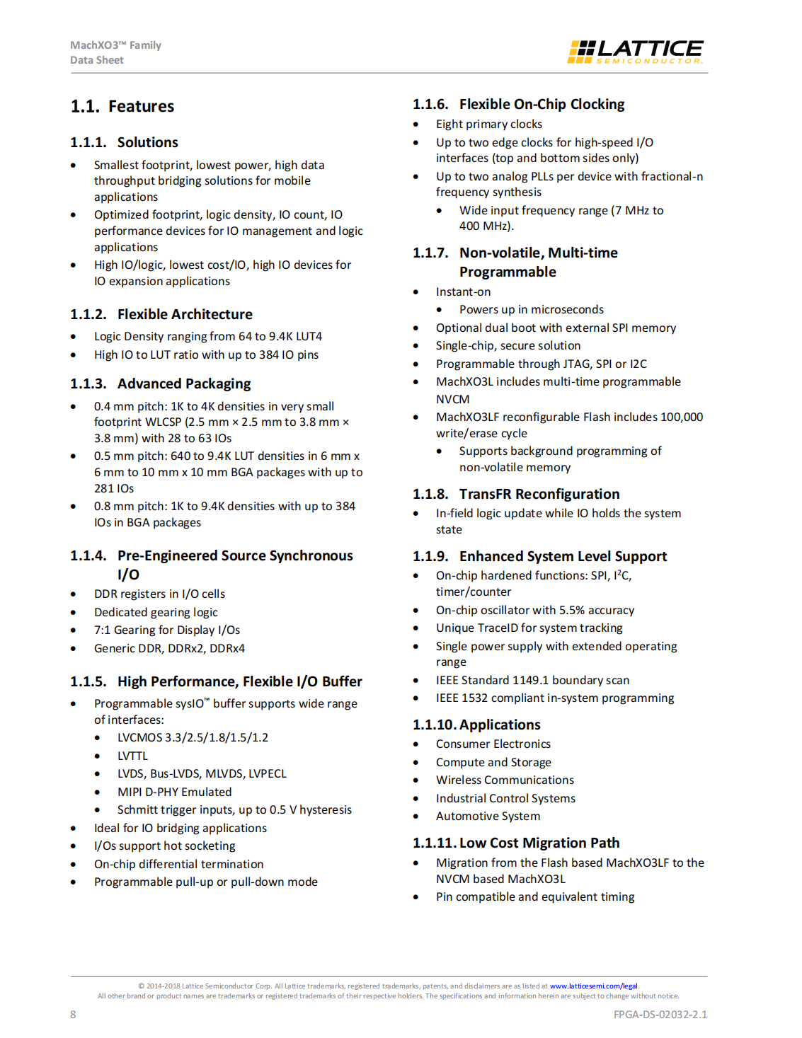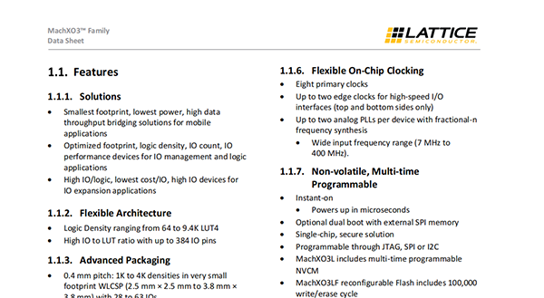 The MachXO3L/LF family of low power,instant-on,non-volatile PLDs has five devices with densities ranging from 640 to 9400 Look-Up Tables(LUTs).In addition to LUT-based,low-cost programmable logic these devices feature Embedded Block RAM(EBR),Distributed RAM,Phase Locked Loops(PLLs),pre-engineered source synchronous I/O support,advanced configuration support including dual-boot capability and hardened versions of commonly used functions such as SPI controller,I2C controller and timer/counter.MachXO3LF devices also support User Flash Memory(UFM).These features allow these devices to be used in low cost,high volume consumer and system applications.