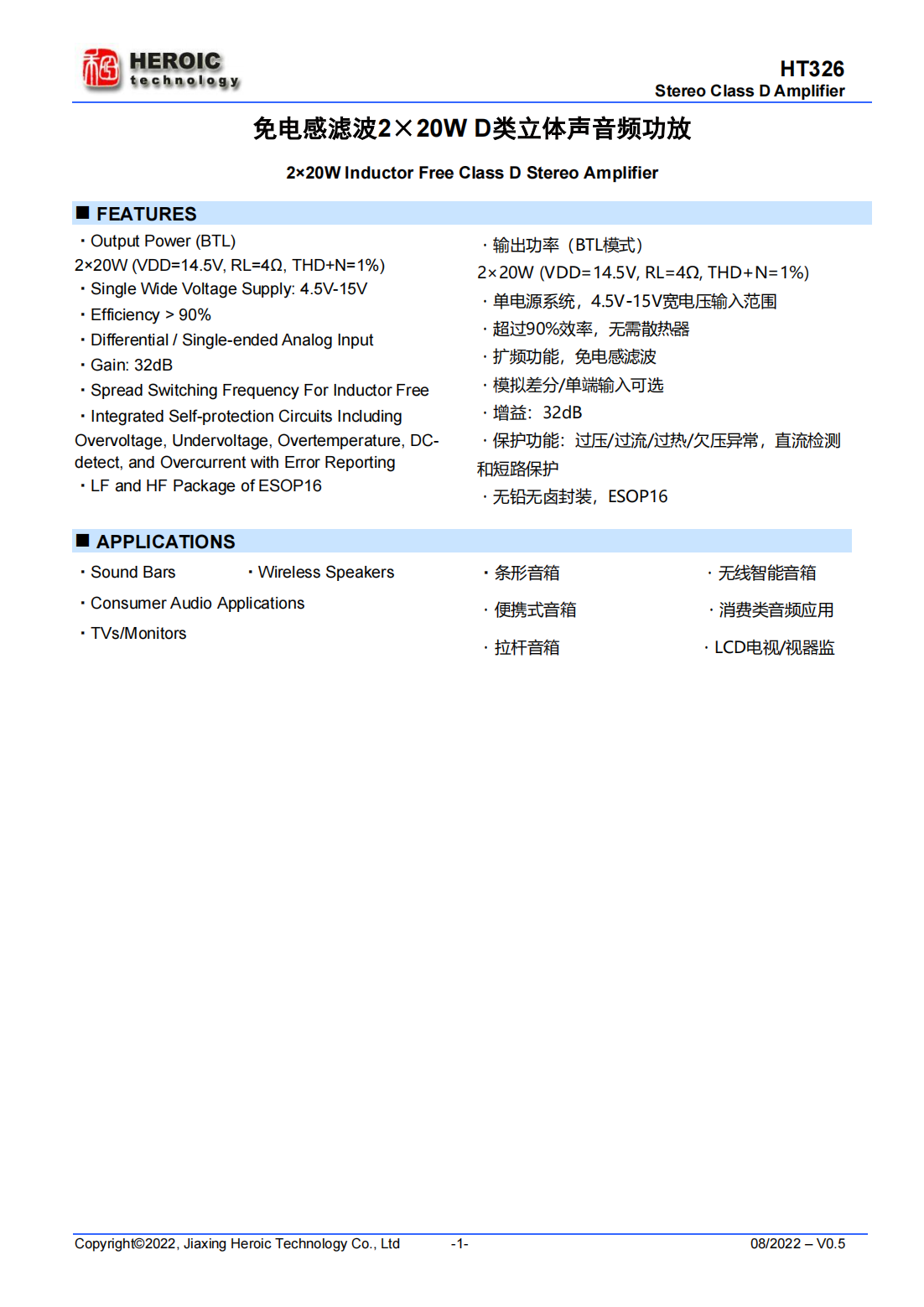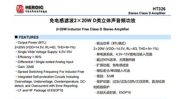 HT326是一款高效D类音频功率放大器。在14.5V供电的、THD+N=1%条件下,能够持续提供2*20W/4Ω功率输出。 HT326具有先进的扩频功能来抑制EMI,使用价格低廉且小体积铁氧体磁珠可满足EMC要求。 此外,HT326内置关断功能使待机电流最小化,还集成了过压保护、直流保护、短路保护、热保护和电源欠压异常保护等功能,可全面防止出现故障。