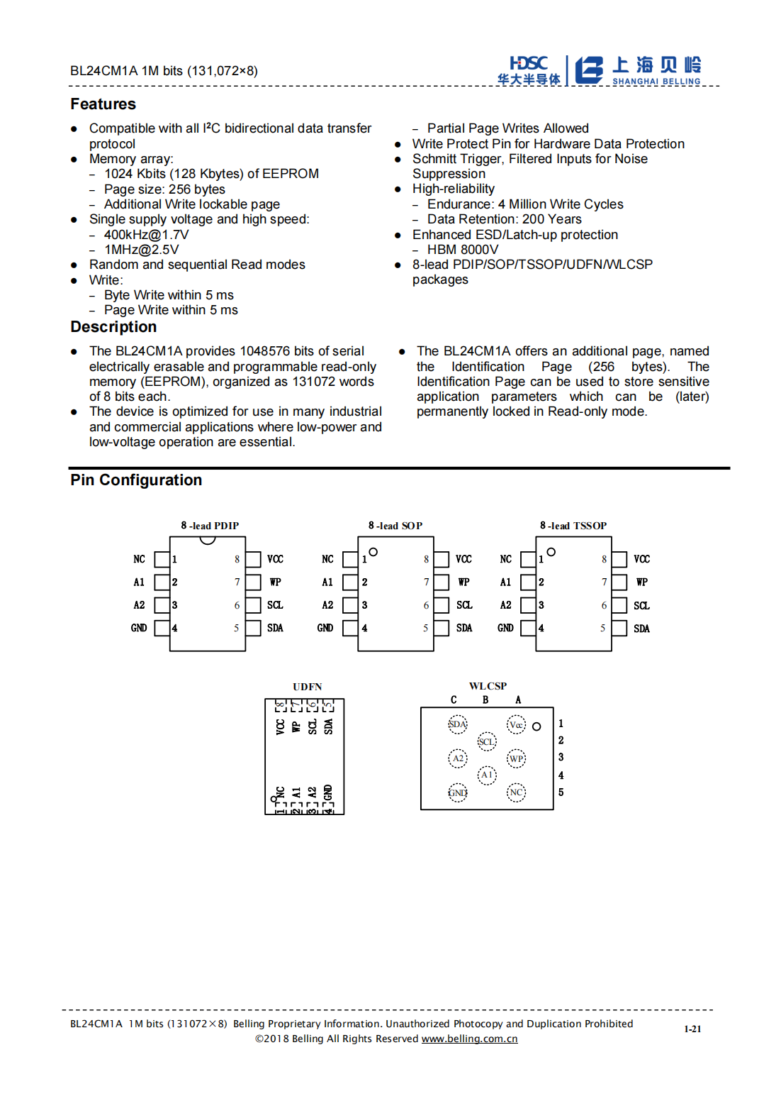 ⚫The BL24CM1A provides 1048576 bits of serial electrically erasable and programmable read-only memory(EEPROM),organized as 131072 words of 8 bits each.