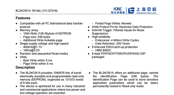 ⚫The BL24CM1A offers an additional page,named the Identification Page(256 bytes).The Identification Page can be used to store sensitive application parameters which can be(later)permanently locked in Read-only mode.