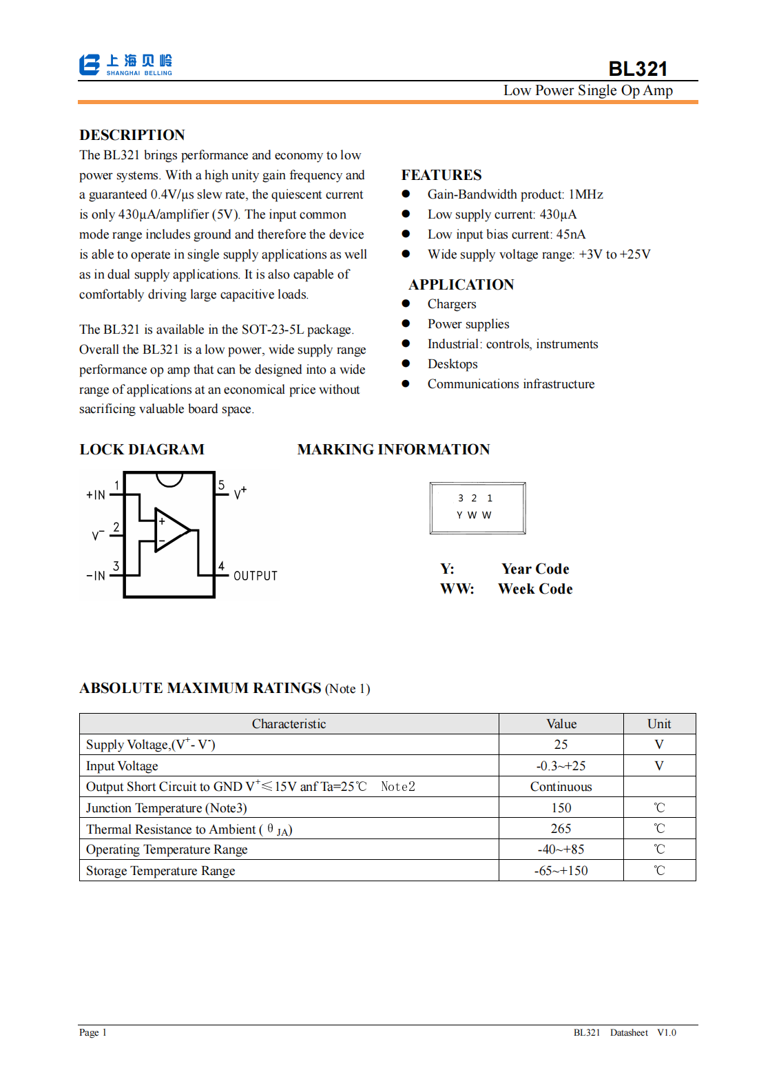 The BL321 is available in the SOT-23-5L package.Overall the BL321 is a low power,wide supply rangeperformance op amp that can be designed into a widerange of applications at an economical price without sacrificing valuable board space.