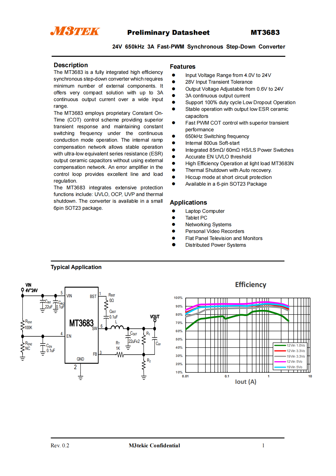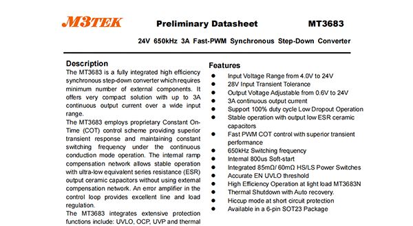The MT3683 is a fully integrated high efficiency synchronous step-down converter which requires minimum number of external components.It offers very compact solution with up to 3A continuous output current over a wide input range.