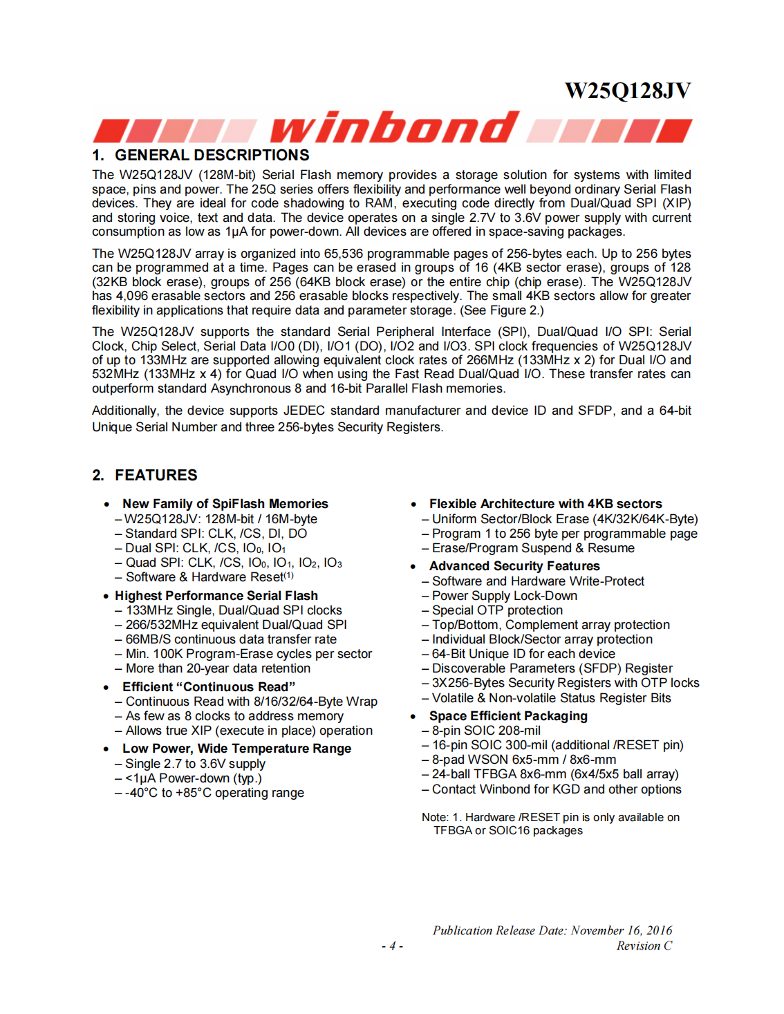 The W25Q128JV supports the standard Serial Peripheral Interface(SPI),Dual/Quad I/O SPI:Serial Clock,Chip Select,Serial Data I/O0(DI),I/O1(DO),I/O2 and I/O3.SPI clock frequencies of W25Q128JV of up to 133MHz are supported allowing equivalent clock rates of 266MHz(133MHz x 2)for Dual I/O and 532MHz(133MHz x 4)for Quad I/O when using the Fast Read Dual/Quad I/O.These transfer rates can outperform standard Asynchronous 8 and 16-bit Parallel Flash memories.Additionally,the device supports JEDEC standard manufacturer and device ID and SFDP,and a 64-bit Unique Serial Number and three 256-bytes Security Registers.