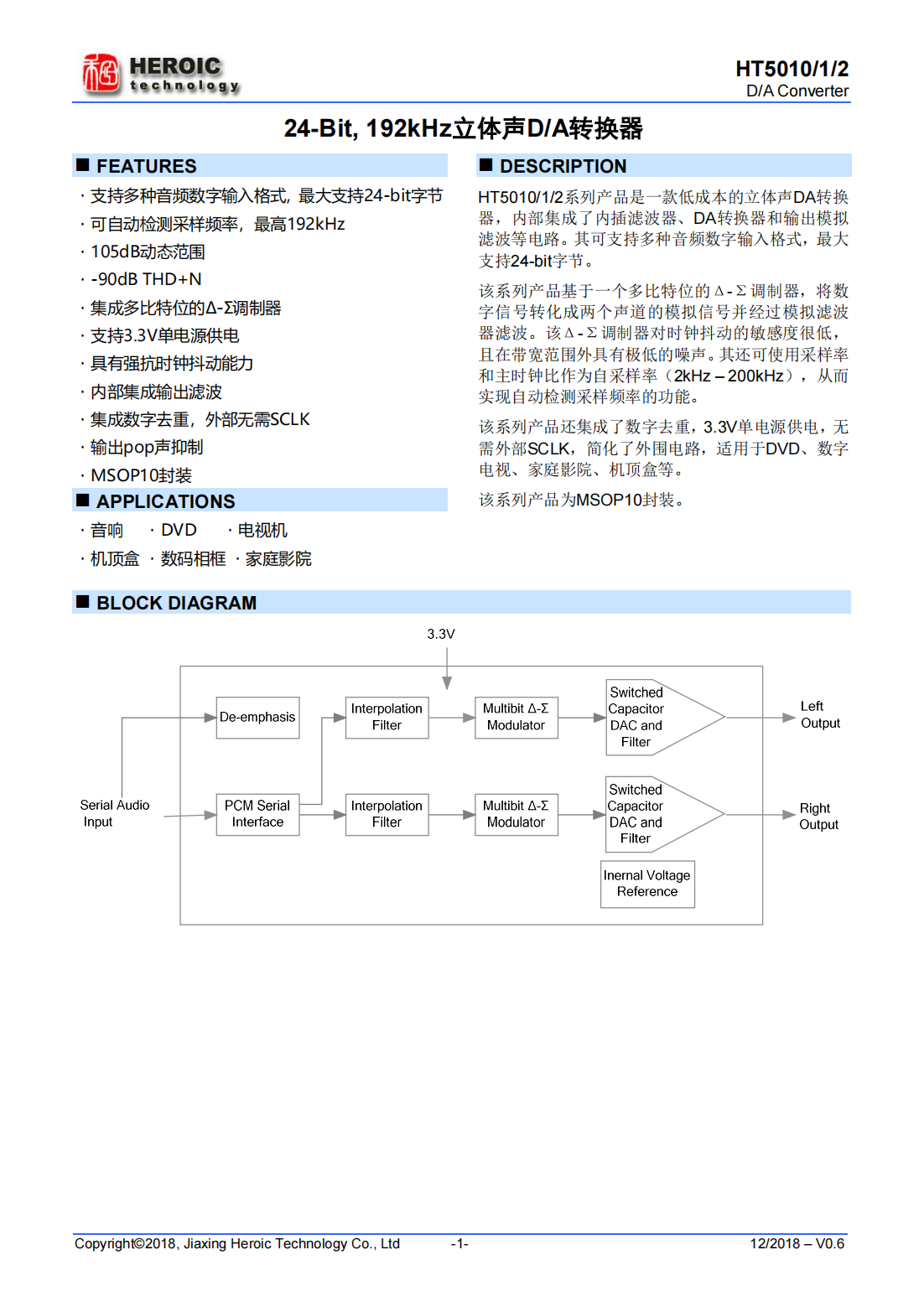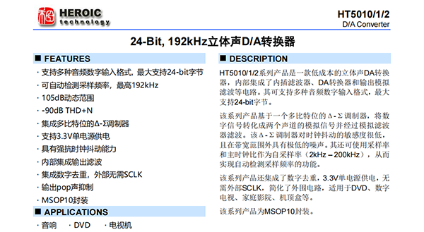 该系列产品还集成了数字去重,3.3V单电源供电,无需外部SCLK,简化了外围电路,适用于DVD、数字电视、家庭影院、机顶盒等。该系列产品为MSOP10封装。