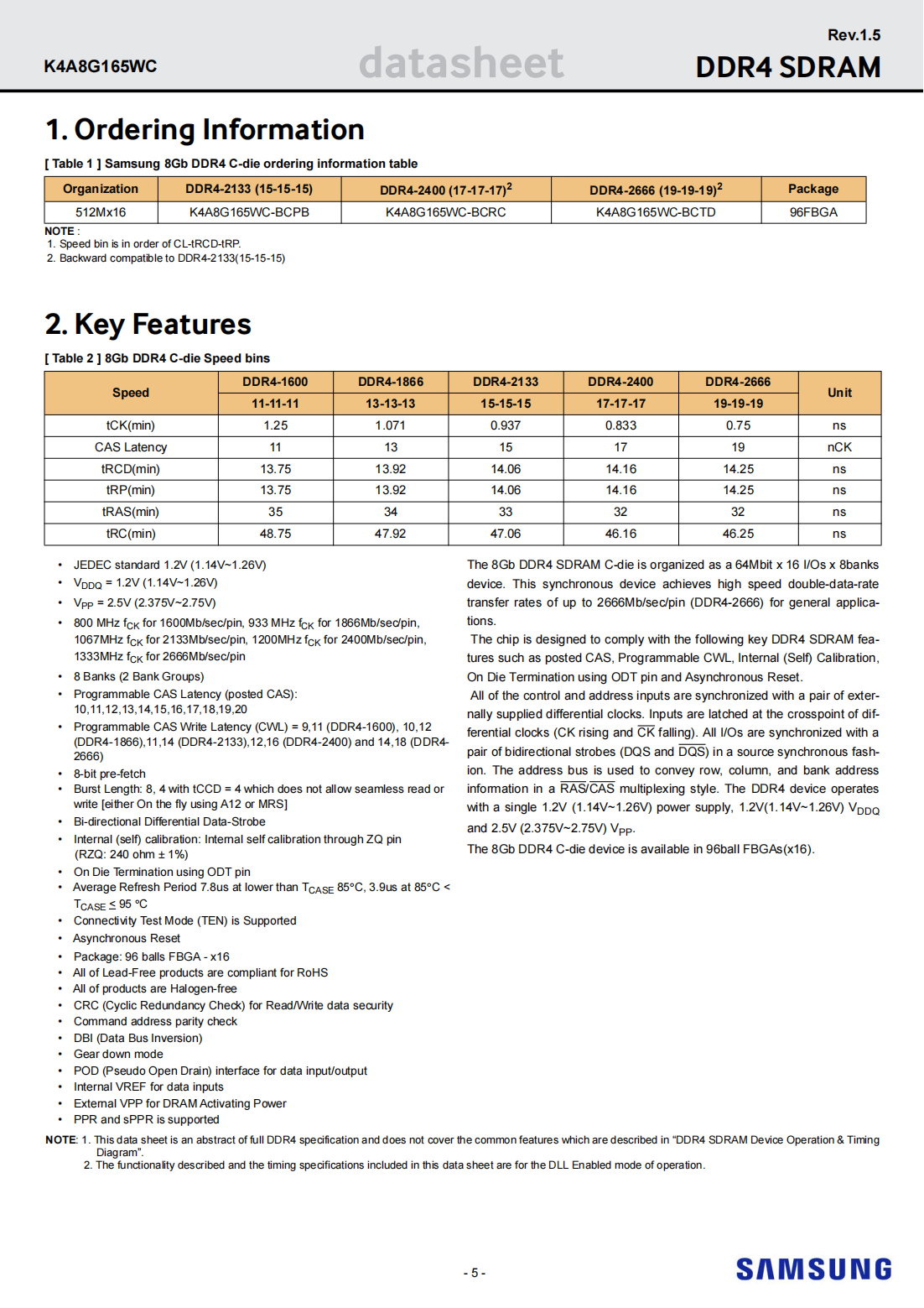 The 8Gb DDR4 SDRAM C-die is organized as a 64Mbit x 16 I/Os x 8banks device.This synchronous device achieves high speed double-data-rate transfer rates of up to 2666Mb/sec/pin(DDR4-2666)for general applications.