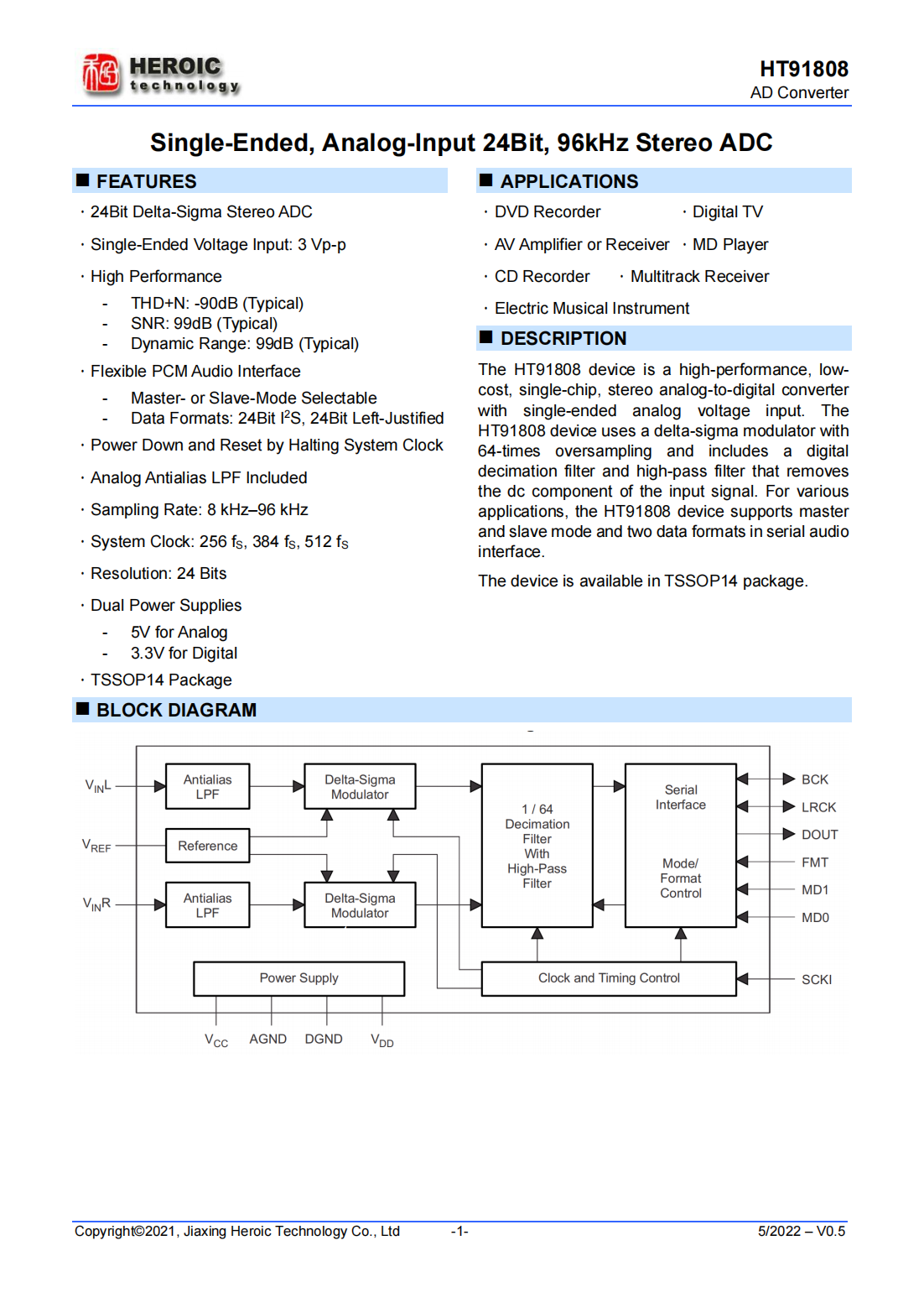 The HT91808 device is a high-performance,lowcost,single-chip,stereo analog-to-digital converter with single-ended analog voltage input.The HT91808 device uses a delta-sigma modulator with 64-times oversampling and includes a digital decimation filter and high-pass filter that removes the dc component of the input signal.For various applications,the HT91808 device supports master and slave mode and two data formats in serial audio interface