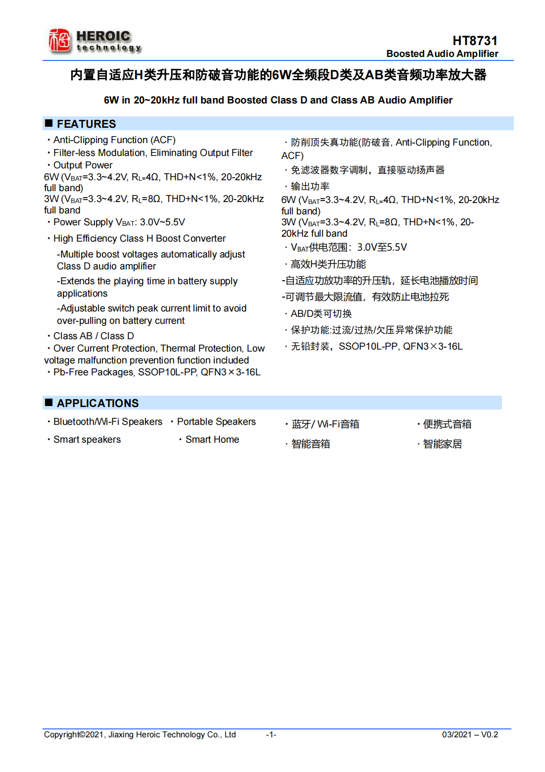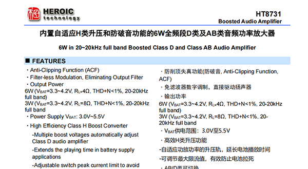 HT8731是一款内置自适应H类升压的单声道D类音频功率放大器,由锂电池供电时,THD+N<1%、20-20kHz全频段信号条件下,能连续输出6W功率(4Ω负载);另外,其还支持AB类模式。