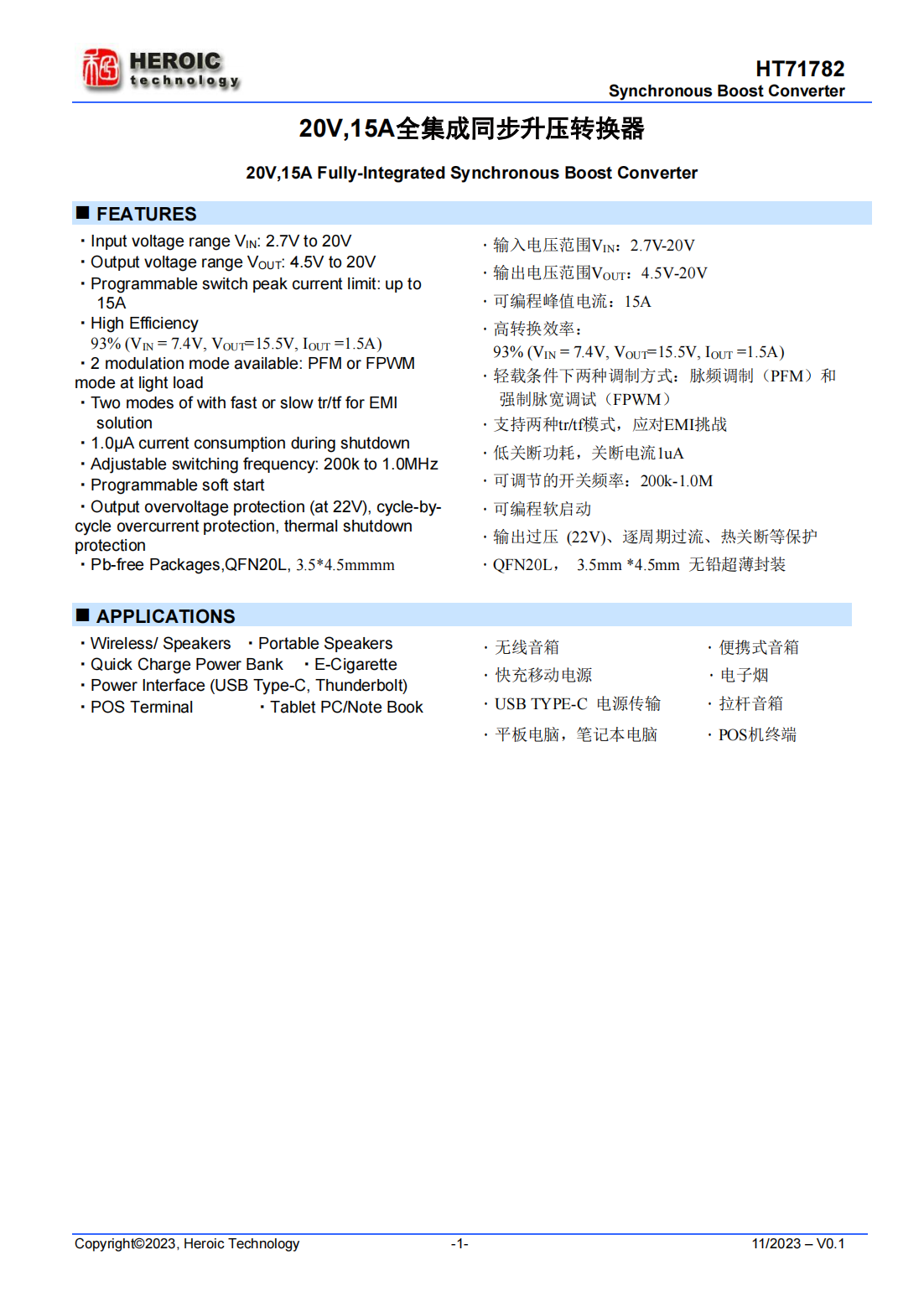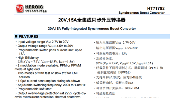 HT71782具有2.7V至20V宽输入电压范围,可为采用单节或两节锂电池的应用提供支持。该器件具备15A开关电流能力,并且能够提供20V的输出电压。