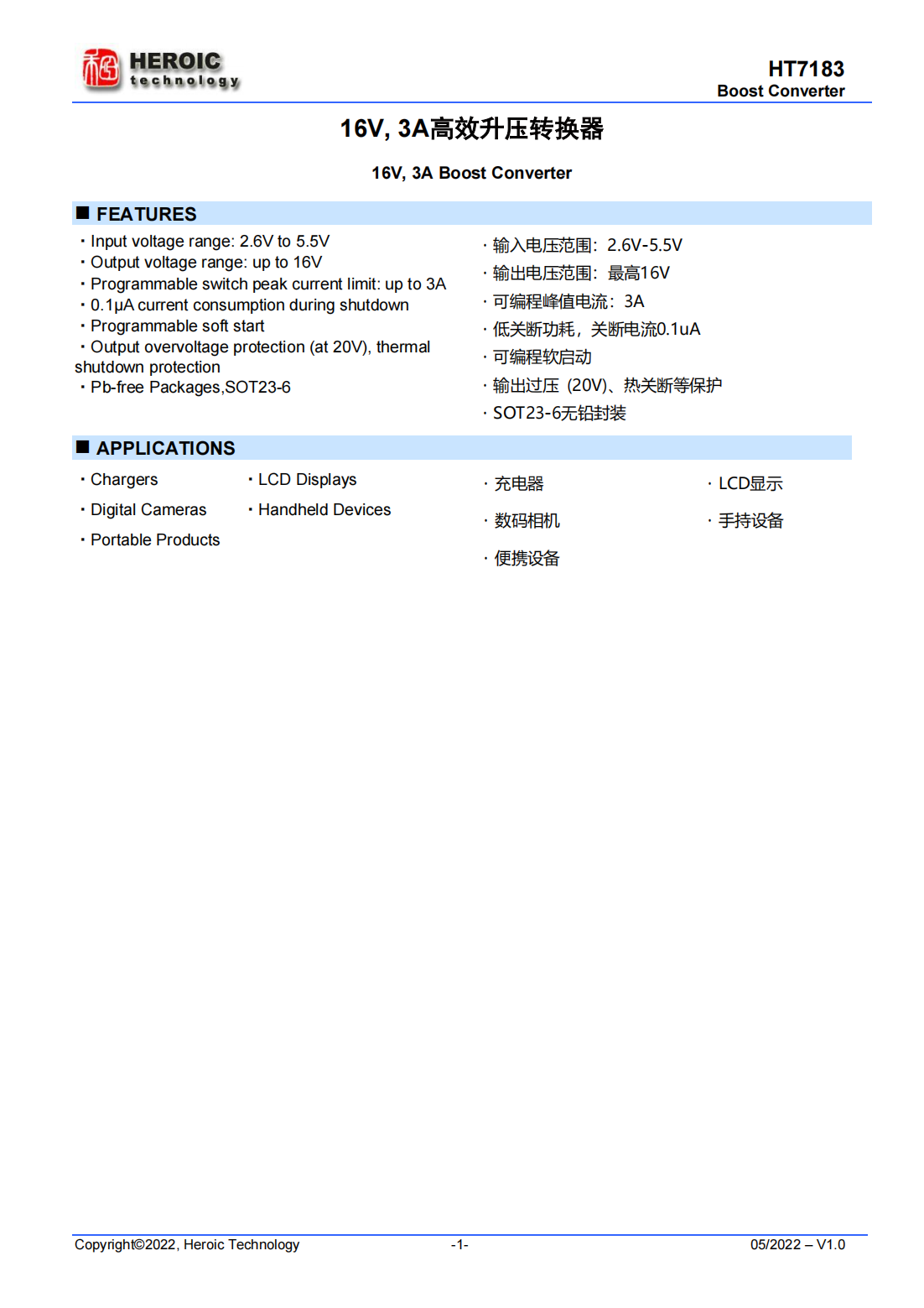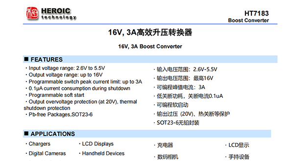 HT7183是一款高功率异步升压转换器,集成120mΩ功率开关管,为便携式系统提供高效的小尺寸华体会网页版登录入口。 HT7183具有2.6V至5.5V输入电压范围,可为各类不同供电的应用提供支持。该器件具备3A开关电流能力,并且能够提供高达16V的输出电压。 HT7183还支持软启动,以及可调节的开关峰值电流限制。 此外,该器件还提供有20V输出过压保护、和热关断保护。