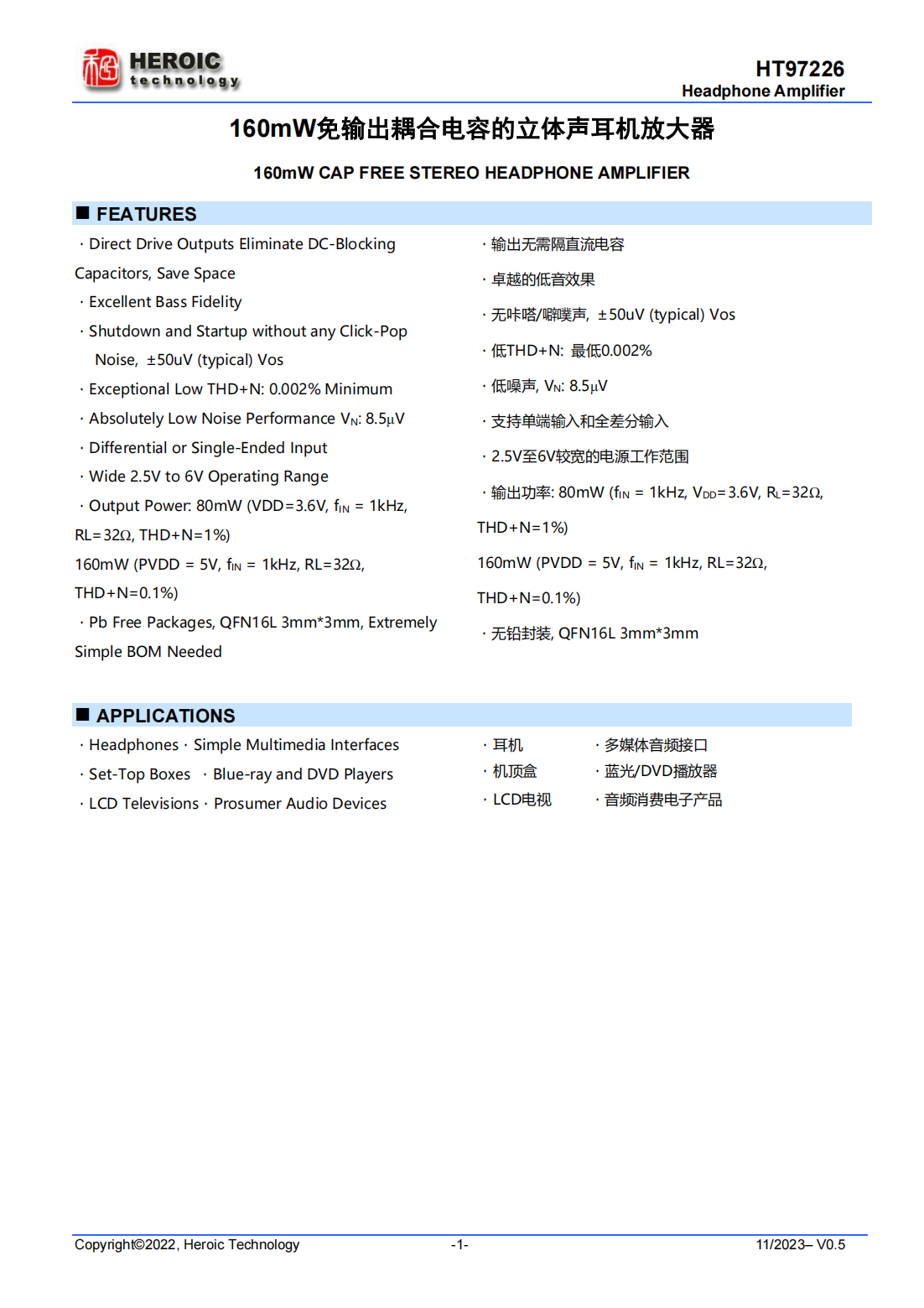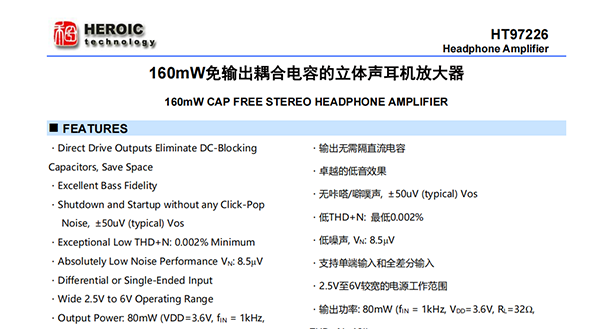 HT97226是一款差分输入/单端输入、可直接输出驱动的耳机放大器。5V供电时,器件可为32ohm耳机提供180mW的功率。器件可通过外部电阻调节增益。器件在音频范围内具有卓越的THD+N表现。 器件内部集成电荷泵产生负电压,器件输出级由输入正电压和该负电压驱动,使得输出偏置在零电位,省去了大尺寸、容易引入失真的输出耦合电容。器件使能开关时,没有咔嗒/噼噗声。 器件封装为3mm x 3mm,16-pin QFN-PP,能在-40°C至+85°C温度范围内工作