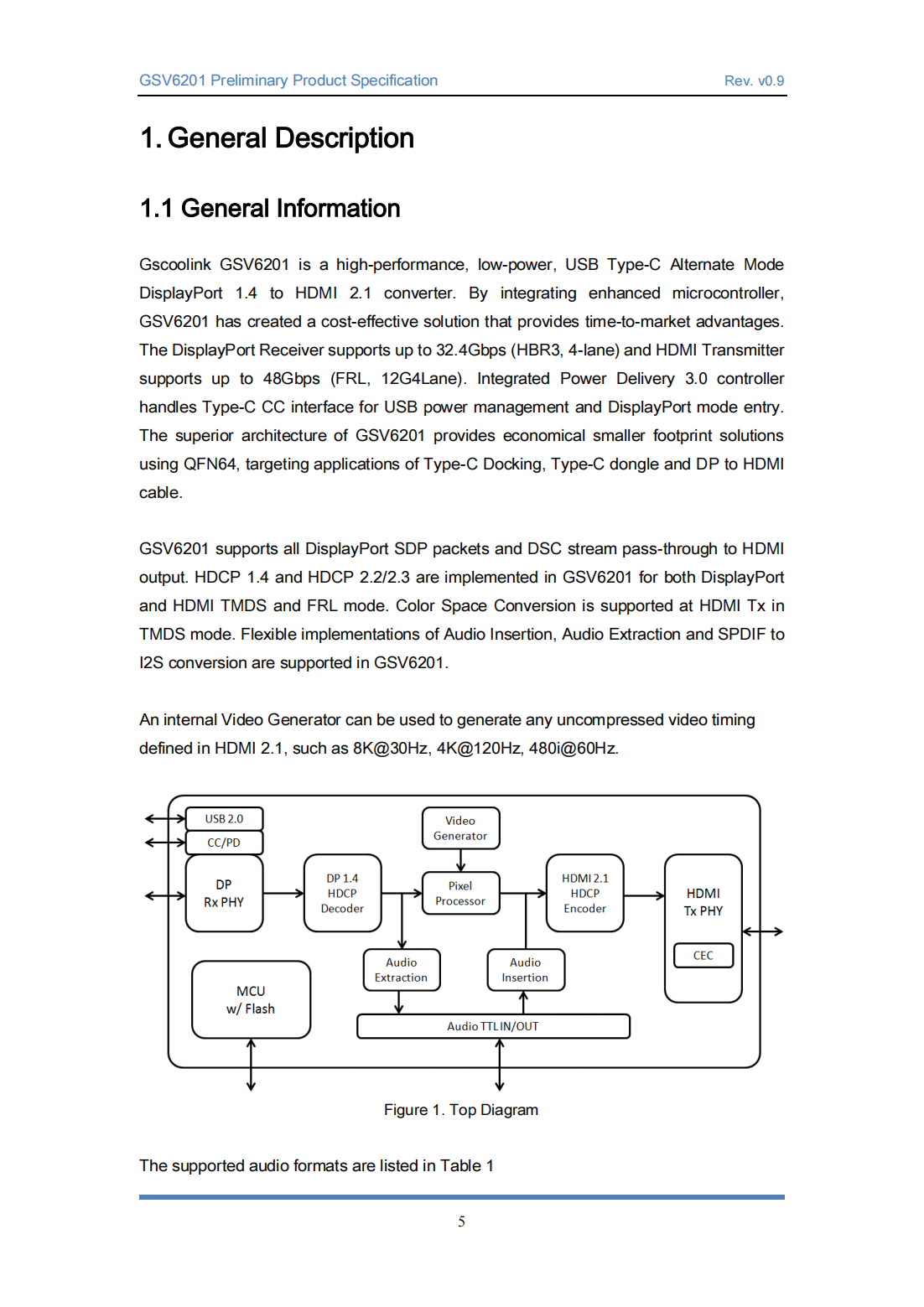 The superior architecture of GSV6201 provides economical smaller footprint solutionsusing QFN64,targeting applications of Type-C Docking,Type-C dongle and DP to HDMI cable.