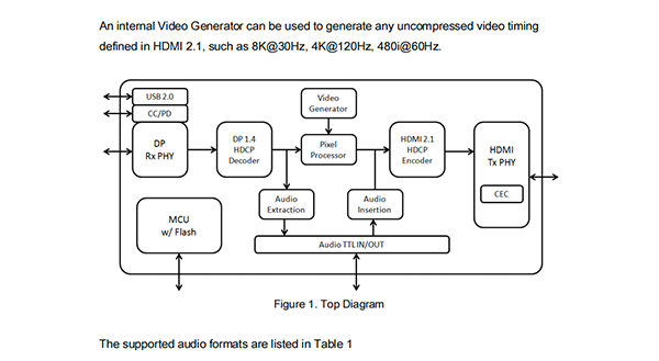 GSV6201 supports all DisplayPort SDP packets and DSC stream pass-through to HDMI output.HDCP 1.4 and HDCP 2.2/2.3 are implemented in GSV6201 for both DisplayPort and HDMI TMDS and FRL mode.Color Space Conversion is supported at HDMI Tx in TMDS mode.Flexible implementations of Audio Insertion,Audio Extraction and SPDIF to I2S conversion are supported in GSV6201.An internal Video Generator can be used to generate any uncompressed video timing defined in HDMI 2.1,such as 8K 30Hz,4K 120Hz,480i 60Hz