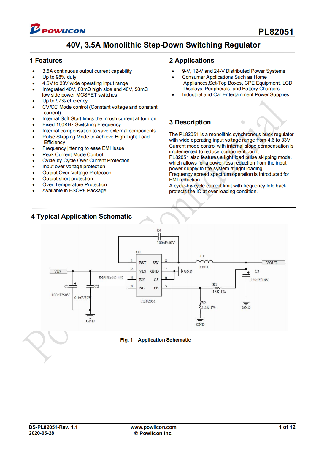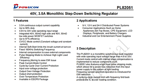 The PL82051 is a monolithic synchronous buck regulator with wide operating input voltage range from 4.6 to 33V.Current mode control with internal slope compensation is implemented to reduce component count.PL82051 also features a light load pulse skipping mode,which allows for a power loss reduction from the input power supply to the system at light loading.Frequency spread spectrum operation is introduced for EMI reduction.A cycle-by-cycle current limit with frequency fold back protects the IC at over loading condition.