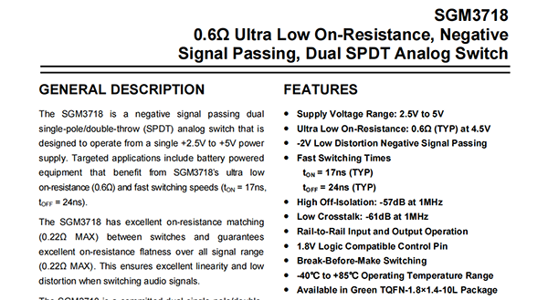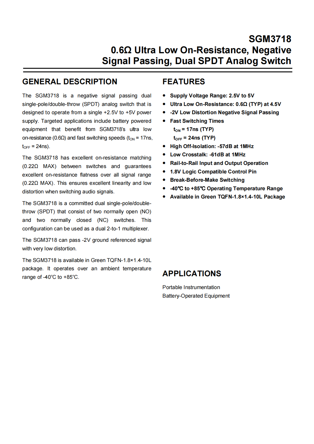The SGM3718 is a negative signal passing dual single-pole/double-throw(SPDT)analog switch that is designed to operate from a single+2.5V to+5V power supply.Targeted applications include battery powered equipment that benefit from SGM3718’s ultra low on-resistance(0.6Ω)and fast switching speeds(tON=17ns,tOFF=24ns).