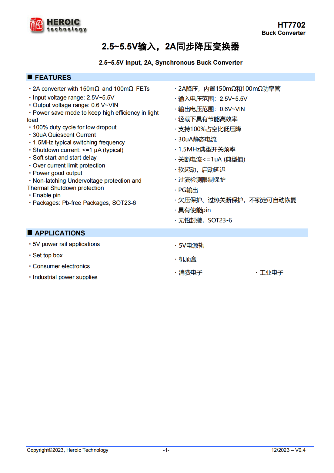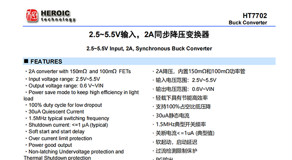 HT7702是一款2A同步降压转换器,具有最少的外部元件和低关断电流。该器件在中到重载时,工作在典型开关频率为1.5MHz的PWM模式;在轻载时,器件工作在高效节能模式。输出电压可通过外部电阻调节。HT7702采用SOT23-6封装。