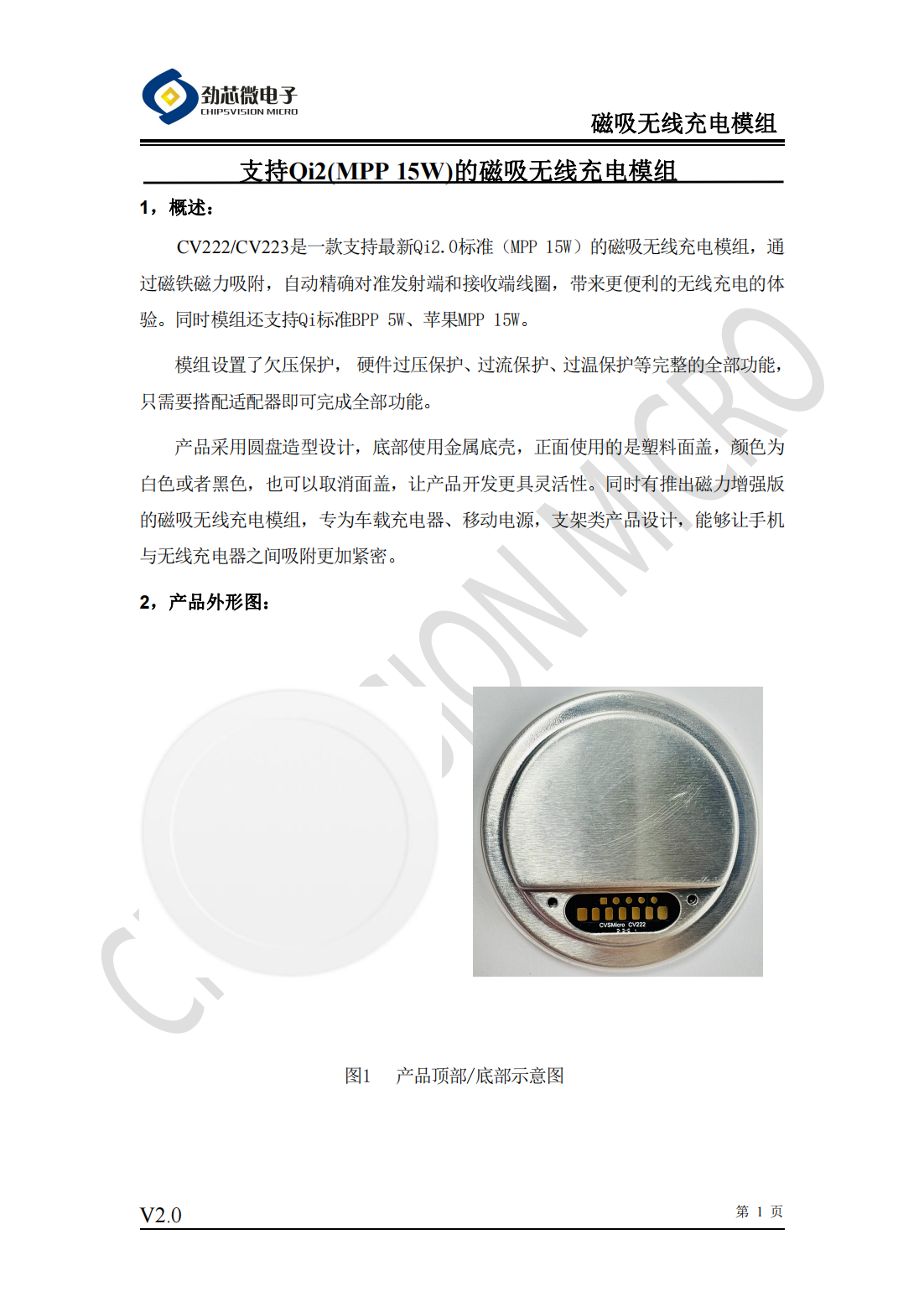 CV222/CV223是一款支持最新Qi2.0标准(MPP 15W)的磁吸无线充电模组,通过磁铁磁力吸附,自动精确对准发射端和接收端线圈,带来更便利的无线充电的体验。同时模组还支持Qi标准BPP 5W、苹果MPP 15W。