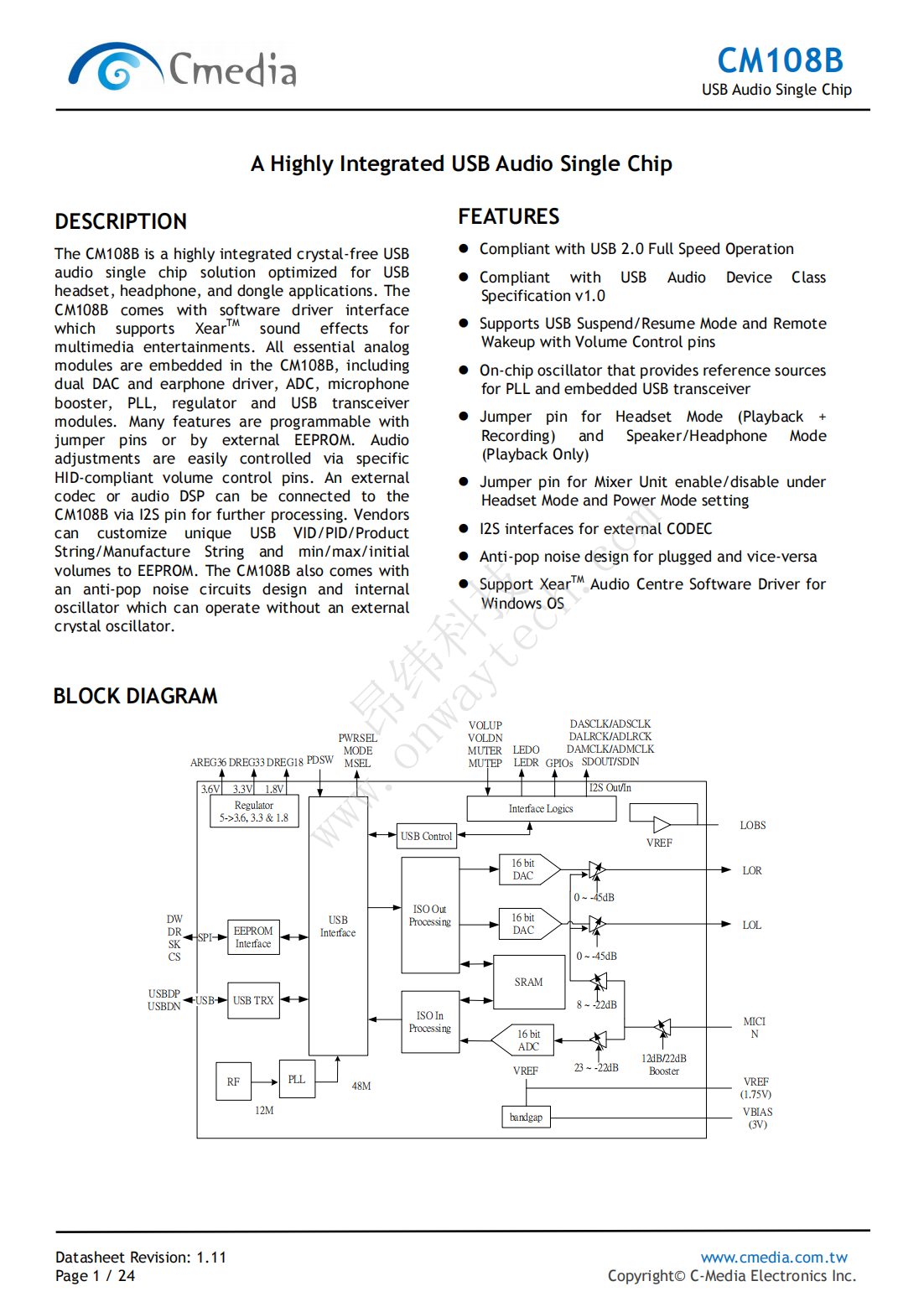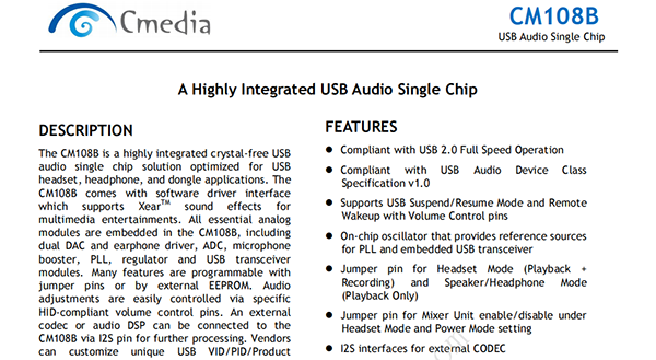 The CM108B is a highly integrated crystal-free USB audio single chip solution optimized for USB headset,headphone,and dongle applications.The CM108B comes with software driver interface which supports XearTM sound effects for multimedia entertainments.All essential analog modules are embedded in the CM108B,including dual DAC and earphone driver,ADC,microphone booster,PLL,regulator and USB transceiver modules.Many features are programmable with jumper pins or by external EEPROM.Audio adjustments are easily controlled via specific HID-compliant volume control pins.An external codec or audio DSP can be connected to the CM108B via I2S pin for further processing.Vendors can customize unique USB VID/PID/Product String/Manufacture String and min/max/initial volumes to EEPROM.The CM108B also comes with an anti-pop noise circuits design and internal oscillator which can operate without an external crystal oscillator.